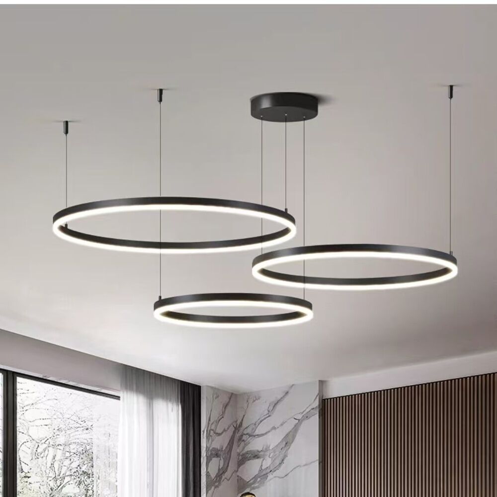 اضاءة معلقة بتصميم عصري بثلاث حلقات سوداء متدرجة الحجم ، تتميز بأناقتها وبساطتها، مما يجعلها إضافة مميزة لأي مساحة داخلية. توفر إضاءة LED دافئة ، بدرجة حرارة لون 3000 كلفن، لتضفي أجواء مريحة ومثالية للاستخدام في غرف المعيشة والممرات وغرف الطعام. مصنوعة من الألومنيوم مع غطاء عالي الجودة الذي يضمن توزيع الضوء بشكل متساوٍ وناعم. تتميز الاضاءة بمتانة وأداء عالٍ، مع تصميم يناسب الديكورات العصرية.