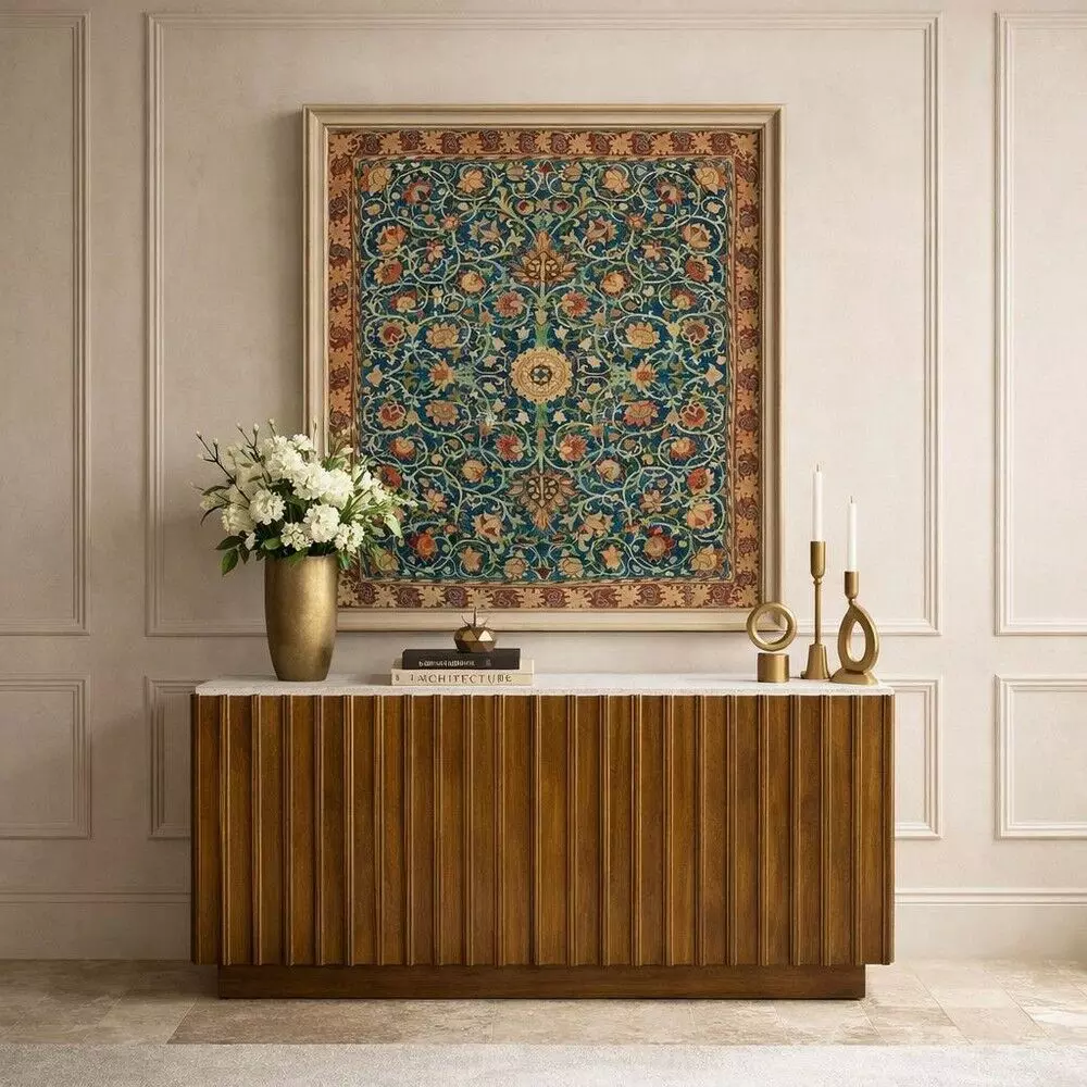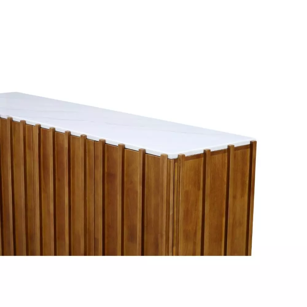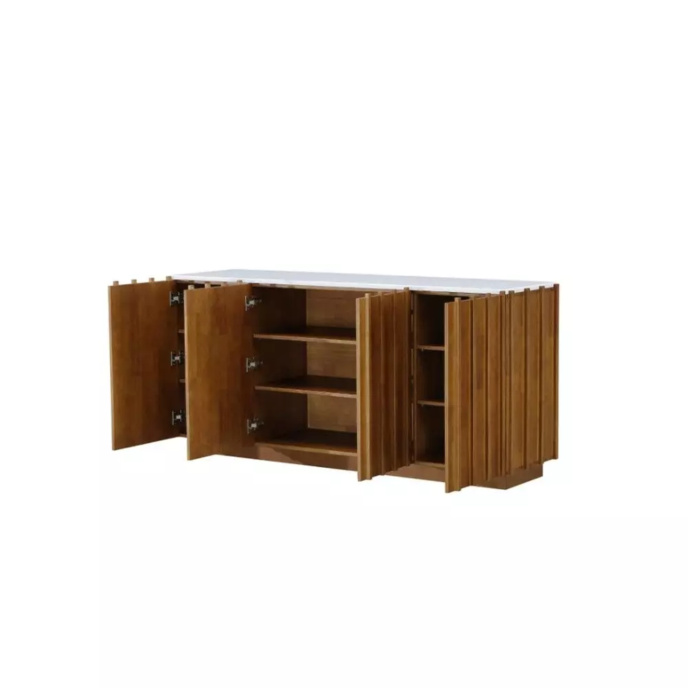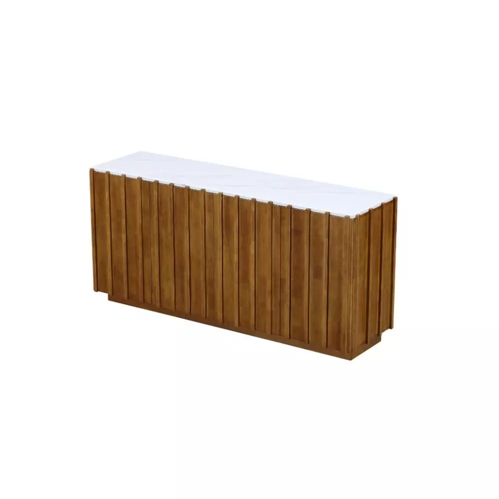 طاولة بوفيه بتصميم عصري يجمع بين الدفء الطبيعي والفخامة الهادئة، حيث يبرز اللون البني الغني بتدرجاته الخشبية مع السطح الأبيض الأنيق، ليمنح القطعة حضورًا راقيًا يناسب غرف الطعام أو المعيشة. التفاصيل الطولية في الواجهة تضيف عمقًا بصريًا ولمسة تصميم حديثة، بينما يعكس السطح العلوي الأبيض إحساسًا بالنقاء والاتساع.