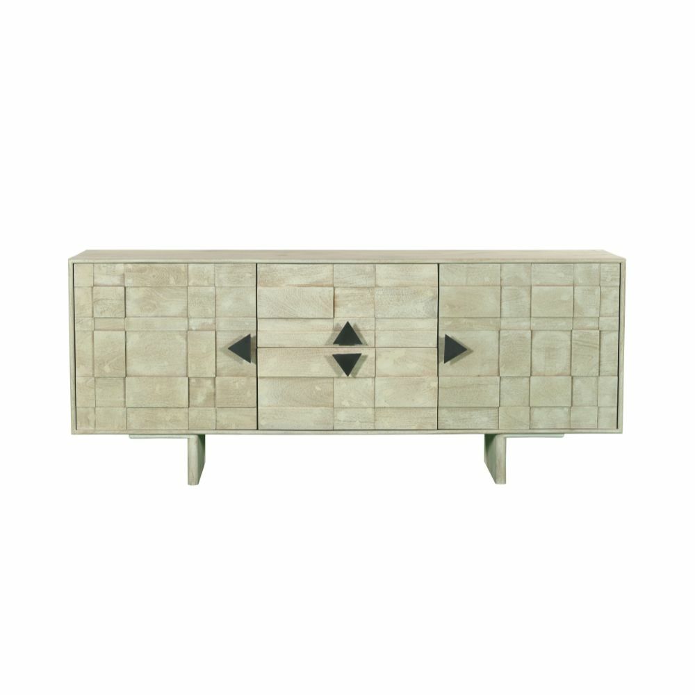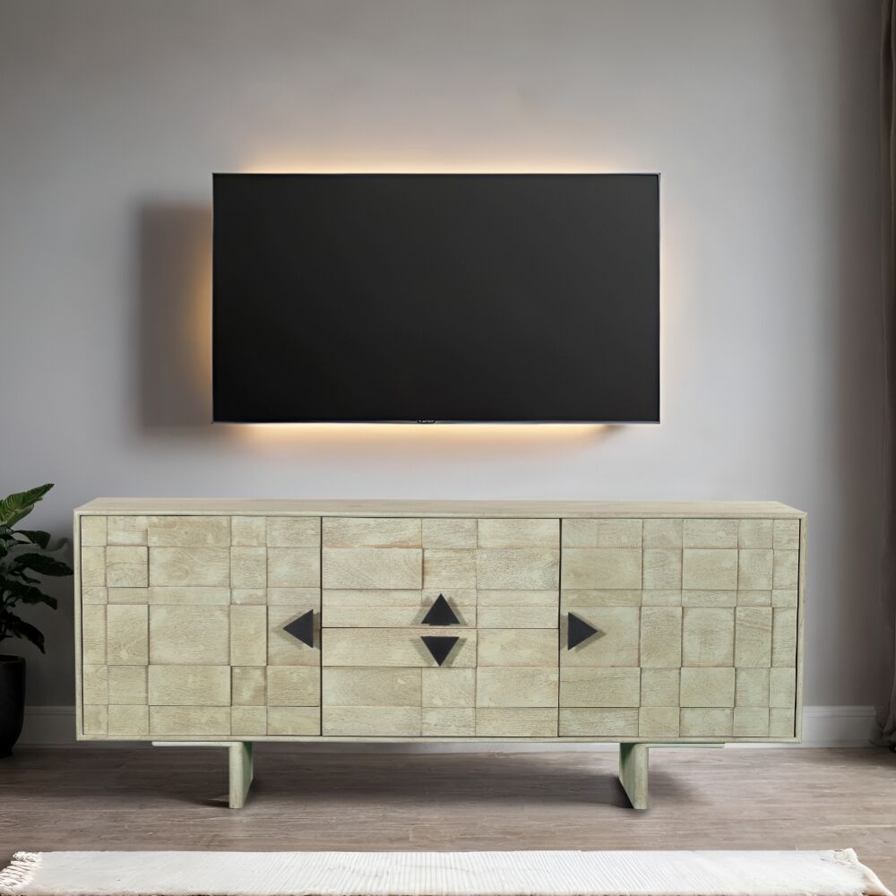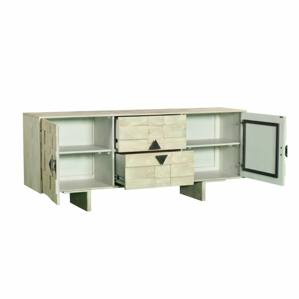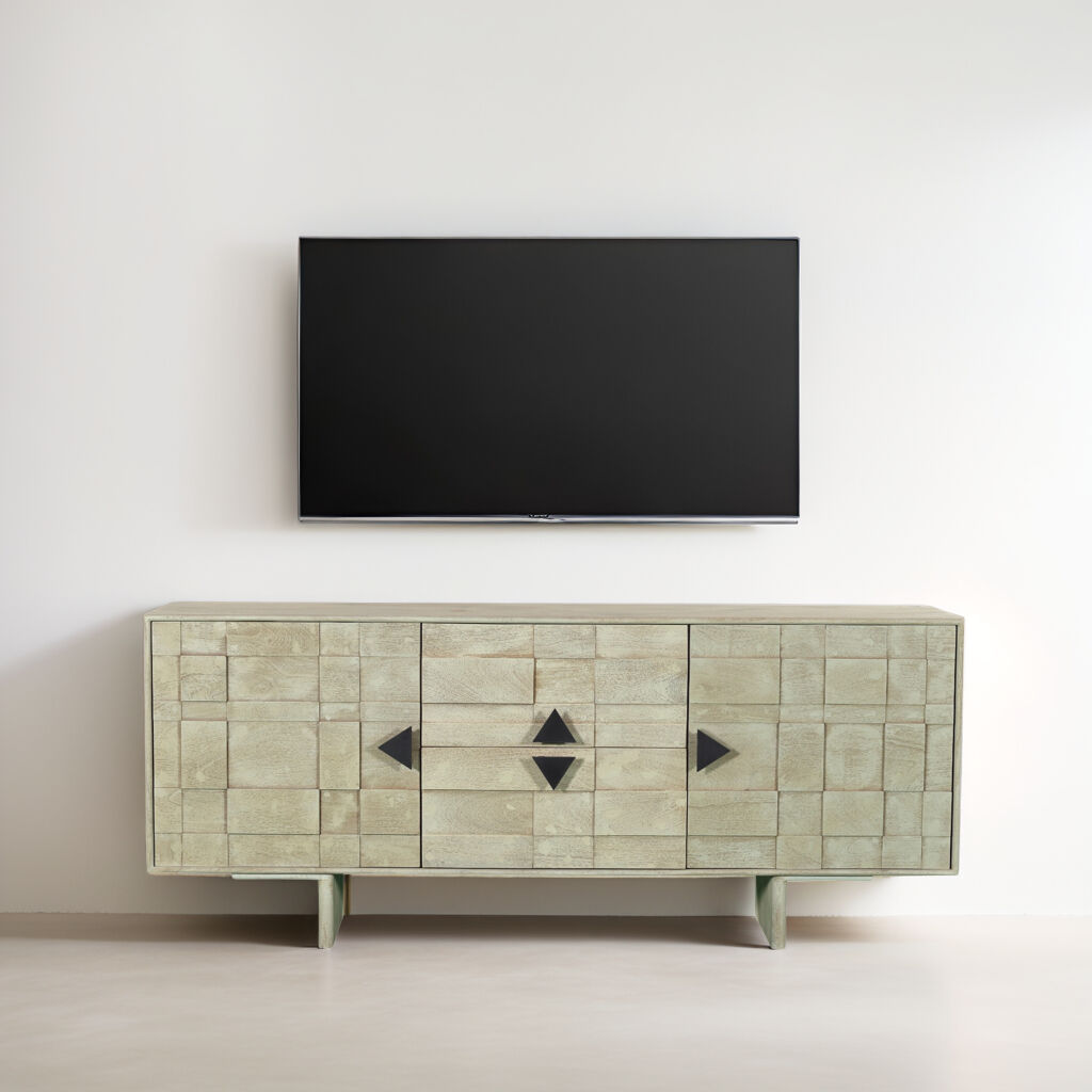 طاولة تلفزيون حديثة وأنيقة، مصممة بعناية لتتناسب مع مختلف أنماط الديكور الداخلي. تأتي بتصميم عملي يجمع بين الجمال والوظيفة مصنوعة من خشب المانجو والحديد.