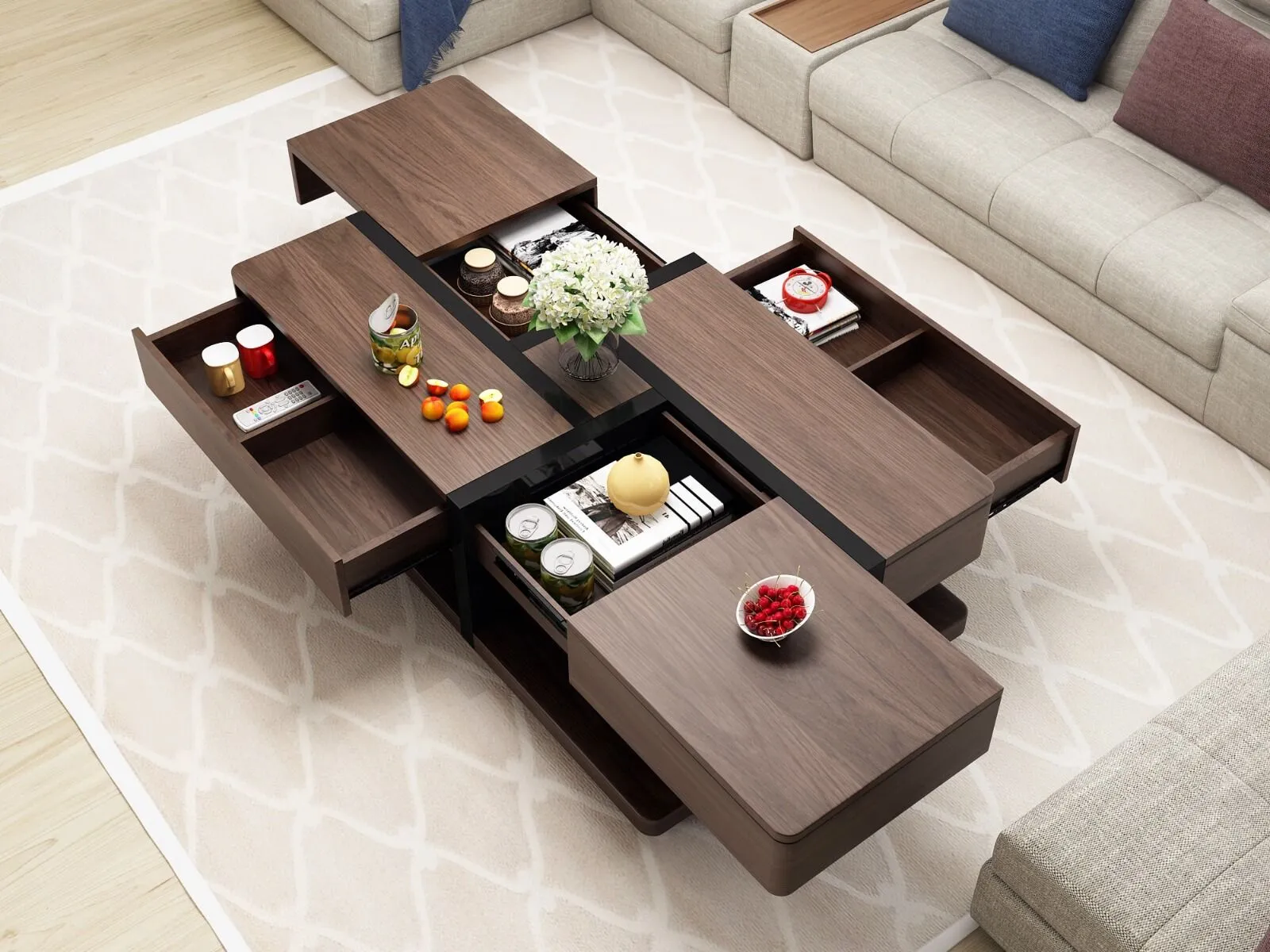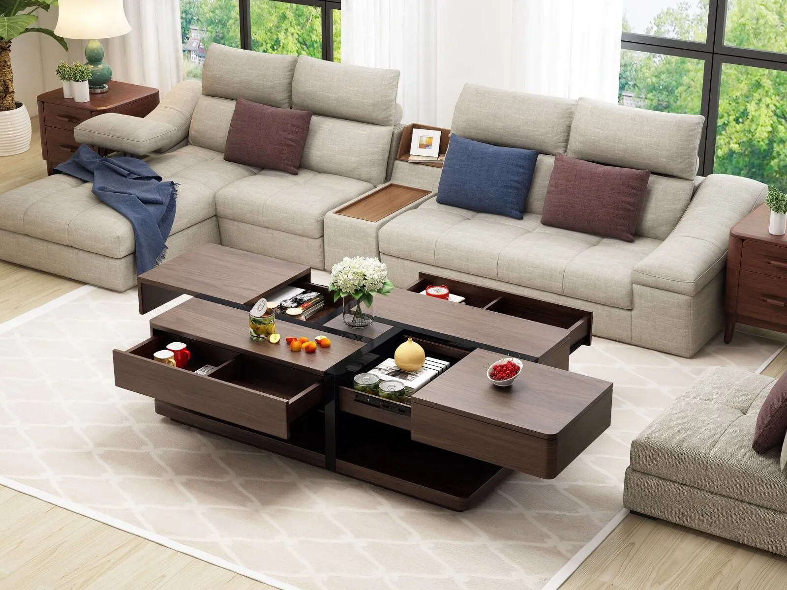تجمع طاولة القهوة من بيتونيا بين الجمال والعملية في تصميم واحد فريد. يضمن التصميم الذكي للطاولة وجود مكان تخزين مخفي تحت سطح الطاولة، مما يوفر مساحة تخزين إضافية للأغراض الصغيرة كالمجلات، الكتب، أو حتى أدوات التحكم عن بُعد. تعد هذه الميزة من أهم المميزات التي تساعد في الحفاظ على الترتيب داخل غرفتك.