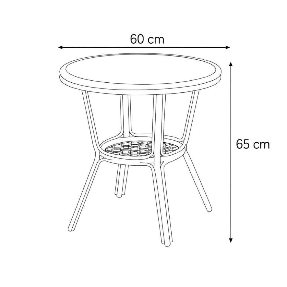 أبعاد المنتج طاولة : قطر 60 سم - ارتفاع 65 سم. الكرسي : العرض 61 سم - العمق 57 سم - الارتفاع 84 سم