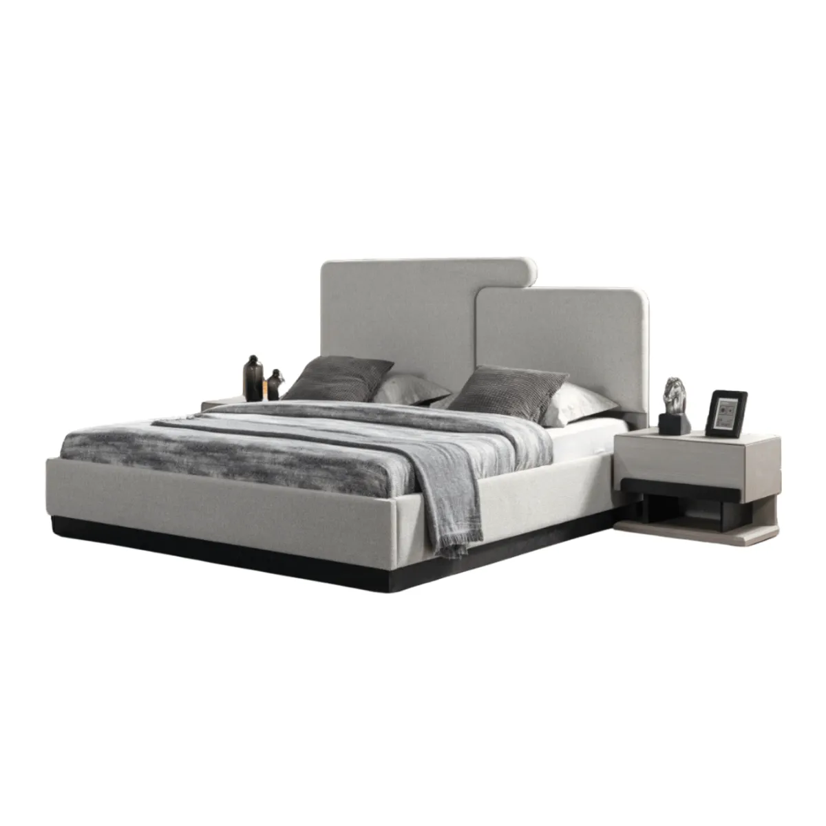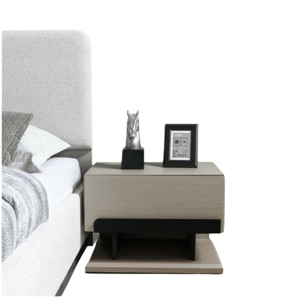 لون المنتج لون السرير رمادي فاتح ولون الكومودينو وطاولة التزيين بيج
