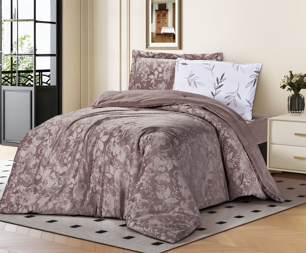 يأتي الطقم لحاف بتصميم أنيق ولون هادئ يضفي لمسة دفء على أجواء غرفتك، مع خامة مريحة وسهلة العناية، ليمنحك تجربة نوم دافئة ومريحة دون عناء.يتناسق الطقم لحاف بسهولة مع مختلف أنماط الديكور والأثاث. نعومة وراحة تدوم