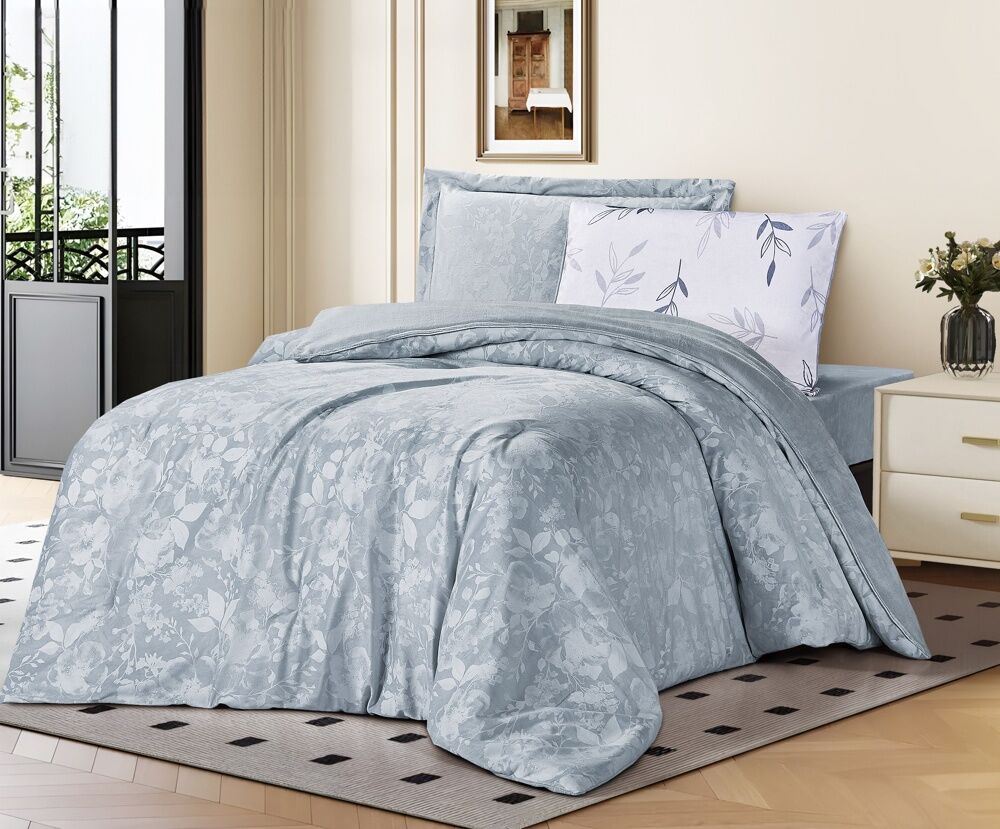 يأتي الطقم لحاف بتصميم أنيق ولون هادئ يضفي لمسة دفء على أجواء غرفتك، مع خامة مريحة وسهلة العناية، ليمنحك تجربة نوم دافئة ومريحة دون عناء.يتناسق الطقم لحاف بسهولة مع مختلف أنماط الديكور والأثاث. نعومة وراحة تدوم