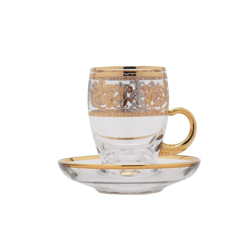 طقم من 6 فناجين شاي مصنوعة من الزجاج مزينة بنقوش ذهبية وفضية, مثالية للإستخدام اليومي أو للضيافة.