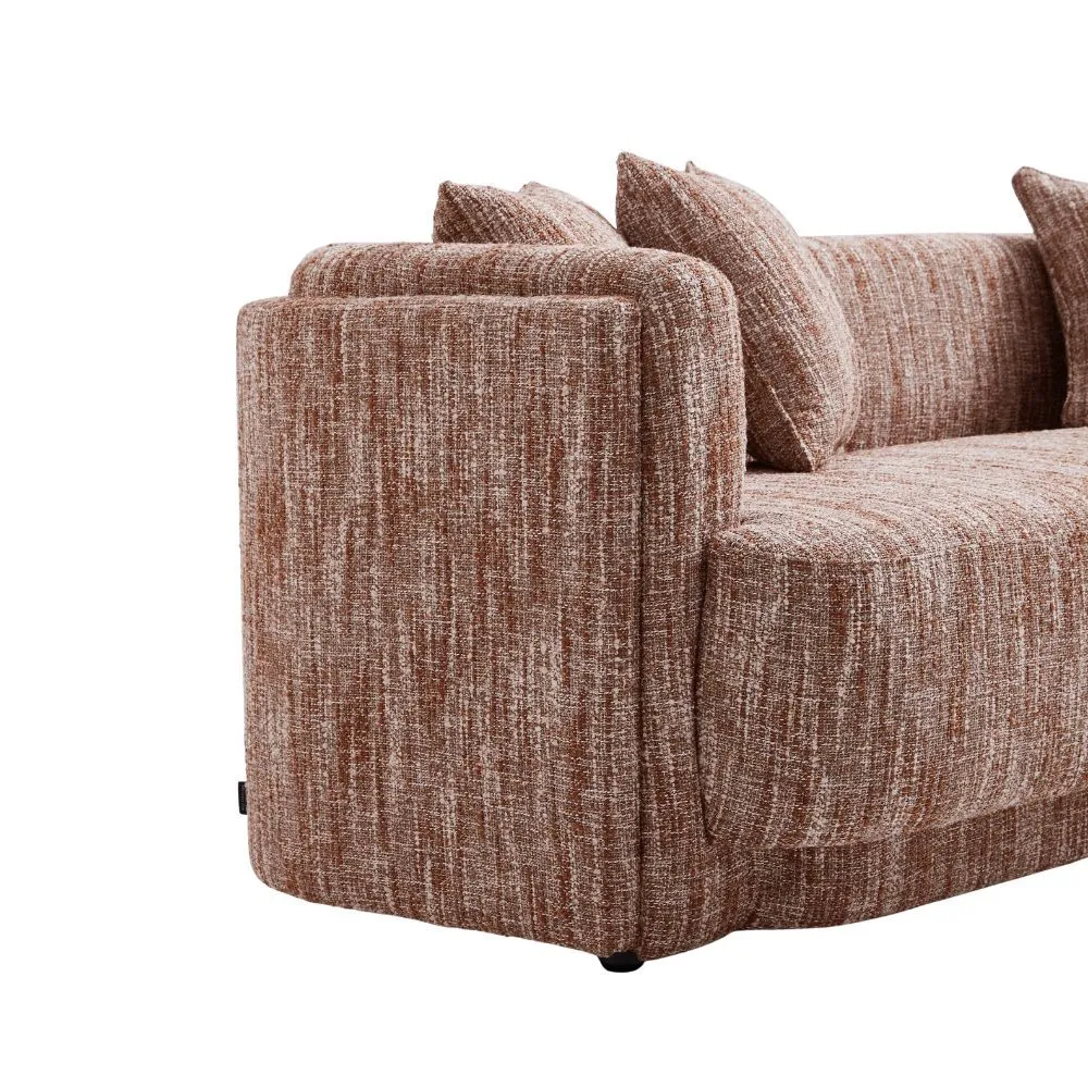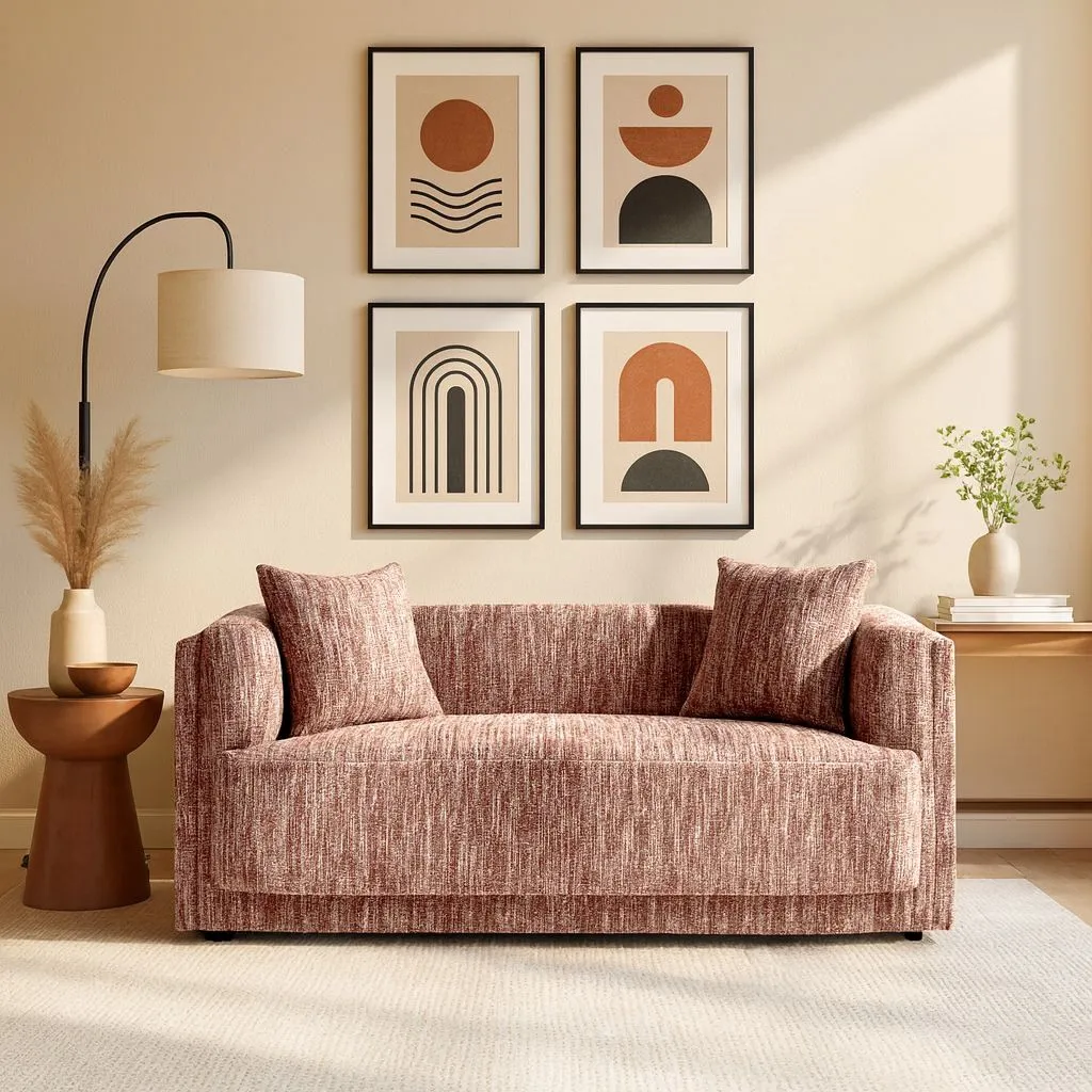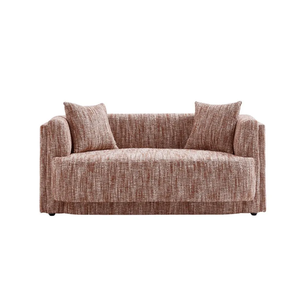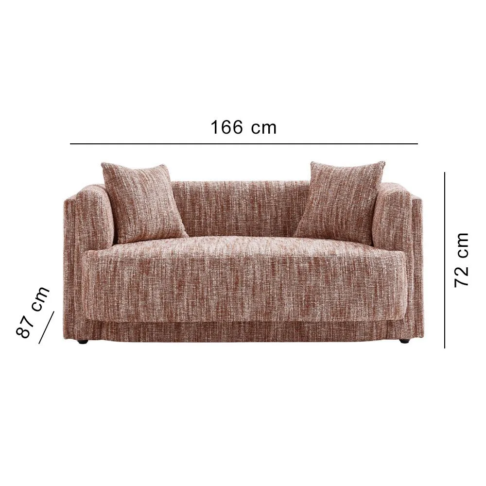 تتميز بتصميم بسيط ومريح. تأتي باللون البني مع نمط خيوط متداخلة ، مما يمنحها مظهراً عصريًا ودافئًا. تحتوي الكنبة على وسادتين صغيرتين مما يزيد من اناقة الكنبة . الأذرع ذات تصميم منخفض ومنحني قليلاً، ما يضيف لمسة من السلاسة والمرونة في الشكل العام. يعتبر هذا النوع من الكنبات مثاليًا لإضافة لمسة من الراحة والأناقة إلى أي مكان.