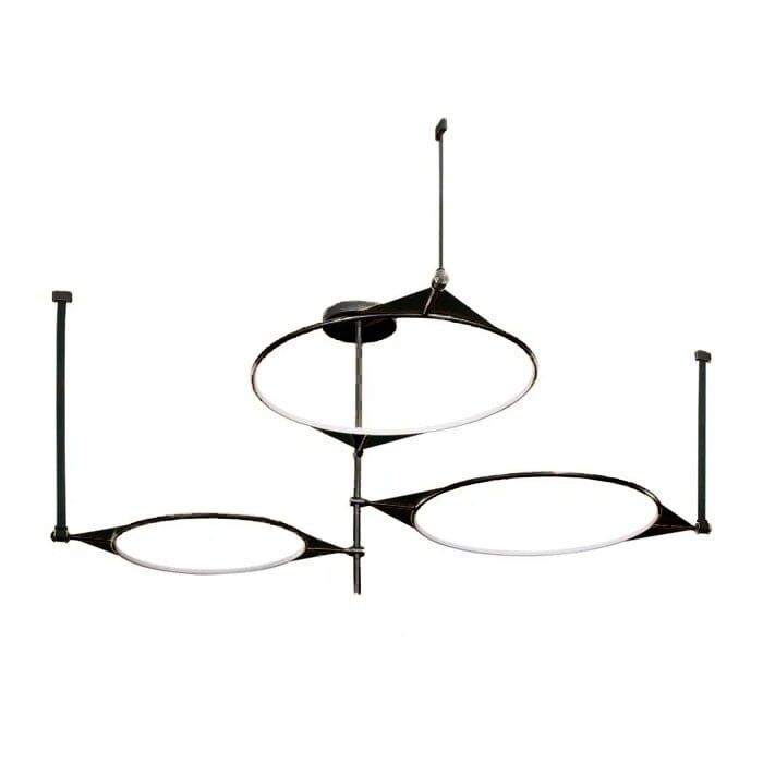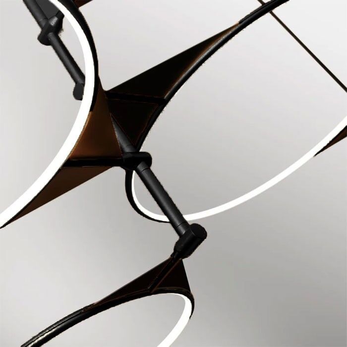 ثريا علاقي لطش 3 دوائر باللون الأسود والذهبي وجلد أسود 70 واط ورملايت 3000k تعمل على إضفاء جو من الدفء والراحة في المساحة التي توضع فيها تعمل هذه المصابيح على توزيع الضوء بشكل متساوٍ في جميع الاتجاهات، مما يخلق أجواء مريحة ومنعشة .