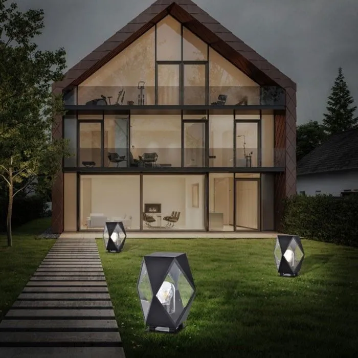 اضاءة خارجية مودرن بشكل الدايموند واللون الرمادي الغامق زجاج والمنيوم تحتاج عدد 1 لمبة E27 المقاس : عرض 20 سم * 20 سم * ارتفاع 33.5 سم