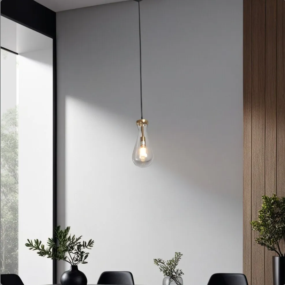 إنارة معلقة بتصميم عصري وأنيق، تتميز بزجاج شفاف على شكل قطرة ماء وقاعدة معدنية جذابة. مناسبة للإضاءة فوق الطاولات أو في غرف المعيشة والمداخل، تضيف لمسة فاخرة لأي مساحة. تدعم قاعدة E14 وتأتي بدون لمبة، ما يمنحك حرية اختيار الإضاءة المناسبة. مثالية للديكورات الحديثة والكلاسيكية.