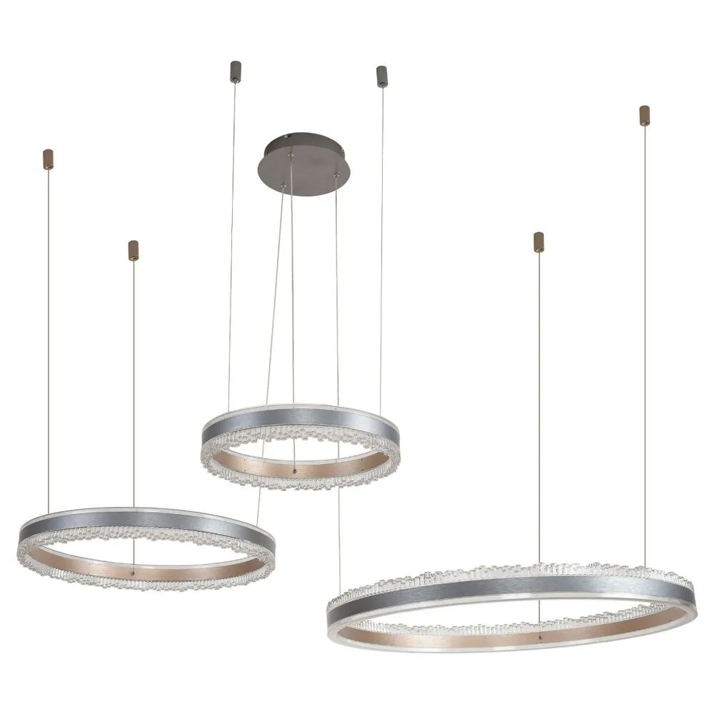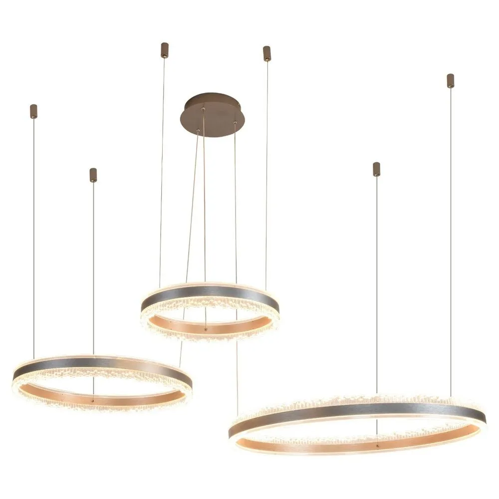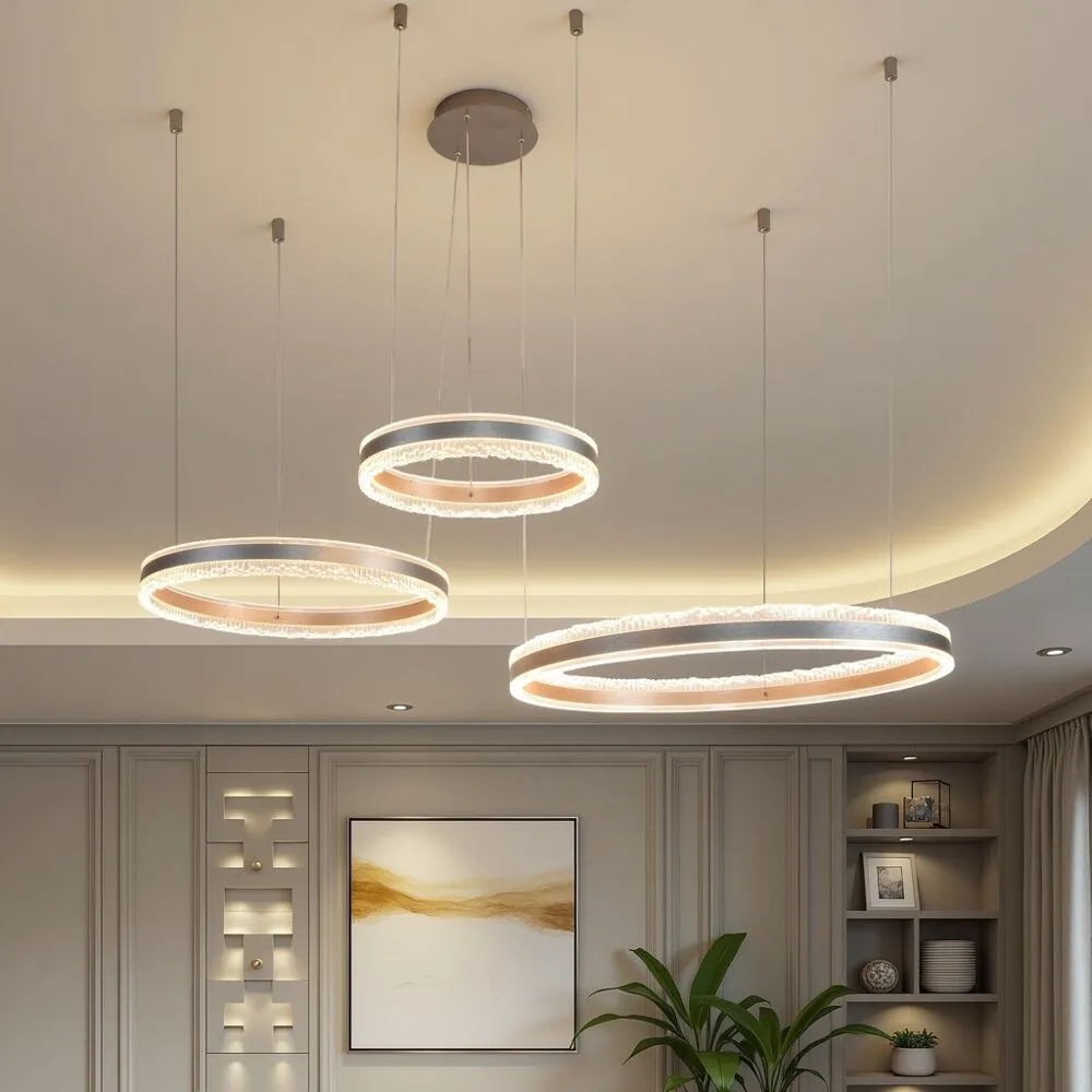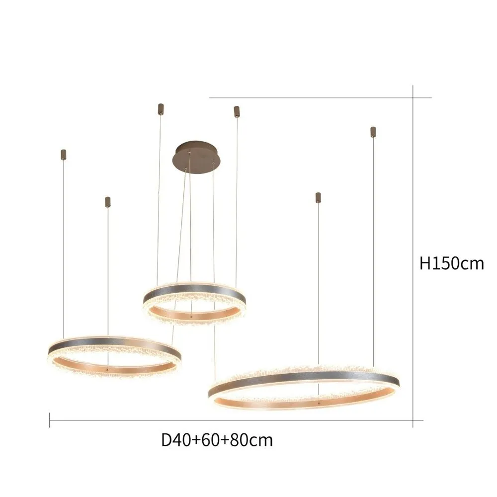 انارة معلقة مودرن أنيقة بتصميم ثلاثي الحلقات متداخلة، تجمع بين البساطة والتميز، وتضفي لمسة عصرية فاخرة على أي مساحة داخلية. تأتي بأقطار مختلفة (40 سم + 60 سم + 80 سم) وبطول إجمالي قابل للتعديل حتى 150 سم لتناسب مختلف ارتفاعات الأسقف.
