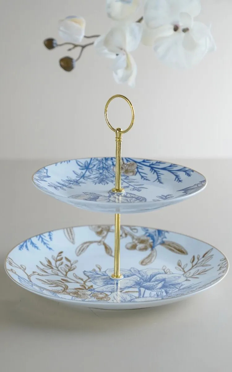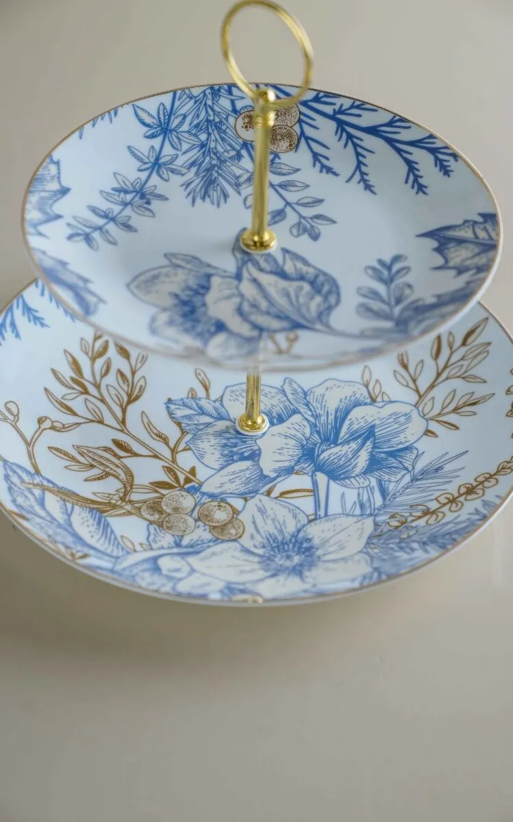 حامل كيك دينور بتصميم مميز يجمع بين روح الطبيعة والالوان الهادئة وفخامة الحواف الذهبية. يشكل حامل الكيك إضافة مميزة لمجموعة أدوات التقديم الخاصة بك فهو متين ومقاوم وطويل الأمد. يزيد أناقة أي طاولة ضيافة وتقديم وسيعجب كل الضيوف بفضل تصميمه الجذاب والزخارف النباتية التي يحملها بدرجات اللون الأزرق الهادئة والجذابة.مواصفات ومميزات حامل كيك دينور: حامل الكيك ثنائي الأدوار مما يسمح لك بتقديم أنواع مختلفة من الكيك والشوكولاه والحلى. قطر الطبقة السفلية الكبيرة 10.5 سم قطر الطبقة العلوية الصغيرة 8 سم المقبض مريح ويسهل عليك حمل حامل الكيك ونقله وتقديم الضيافة مطلي بلون ذهبي فاخر وثابت مع الزمن. حامل الكيك مصنوع من البورسلين نوع نيو بون المضاف له أوكسيد الكالسيوم خلال عملية التصنيع ليعطيه متانة عالية ومقاومة للخدش والكسر ويجعله طويل الأمد بالإضافة لإعطاءه مظهر جذاب ولون أبيض ناصع. بفضل متانة الطبق يمكنك غسله في غسالة الصحون وتوفير جهد الجلي والتنظيف