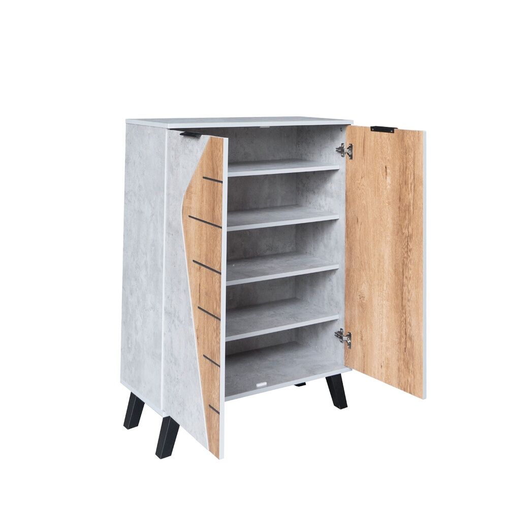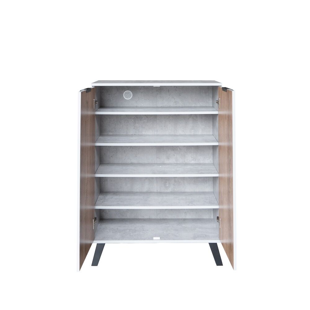 تحتوي خزانة الأحذية على عدة رفوف مغلقة بأبواب، مما يساعد في ترتيب الأحذية بشكل أنيق وسهل الوصول إليها.