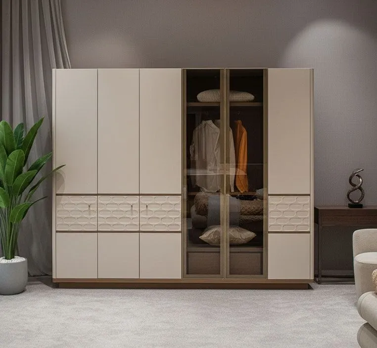 دولاب الملابس برادا الفاخر هو الحل الأمثل لمن يبحث عن التنظيم المثالي والأناقة المعاصرة في غرفة النوم. يتميز هذا الدولاب بجمعه بين التصميم العصري والجودة العالية، مما يمنحه قدرة على تلبية كافة احتياجات التخزين الخاصة بك مع الحفاظ على لمسة فخامة. تم تصنيع الدولاب من خامات MDF عالية الجودة مع تشطيب ميلامين متين مقاوم للخدوش والرطوبة، لضمان متانة تدوم لسنوات طويلة. تصميمه الواسع يضم ستة أبواب، منها بابان زجاجيان أنيقان، ما يوفر مساحة كبيرة لتخزين الملابس والاكسسوارات بطريقة منظمة وعملية.