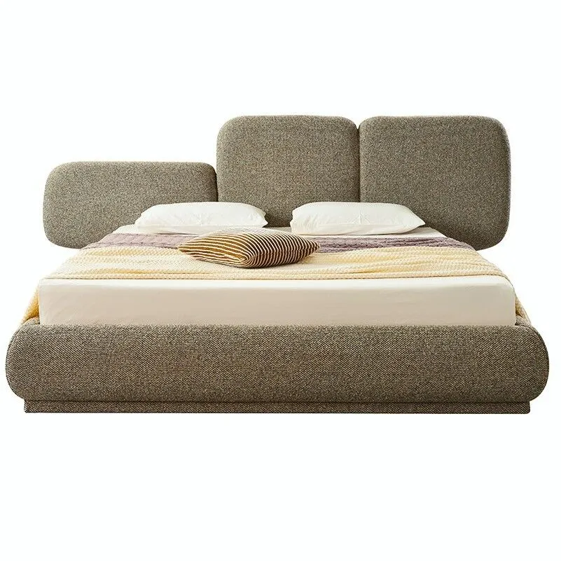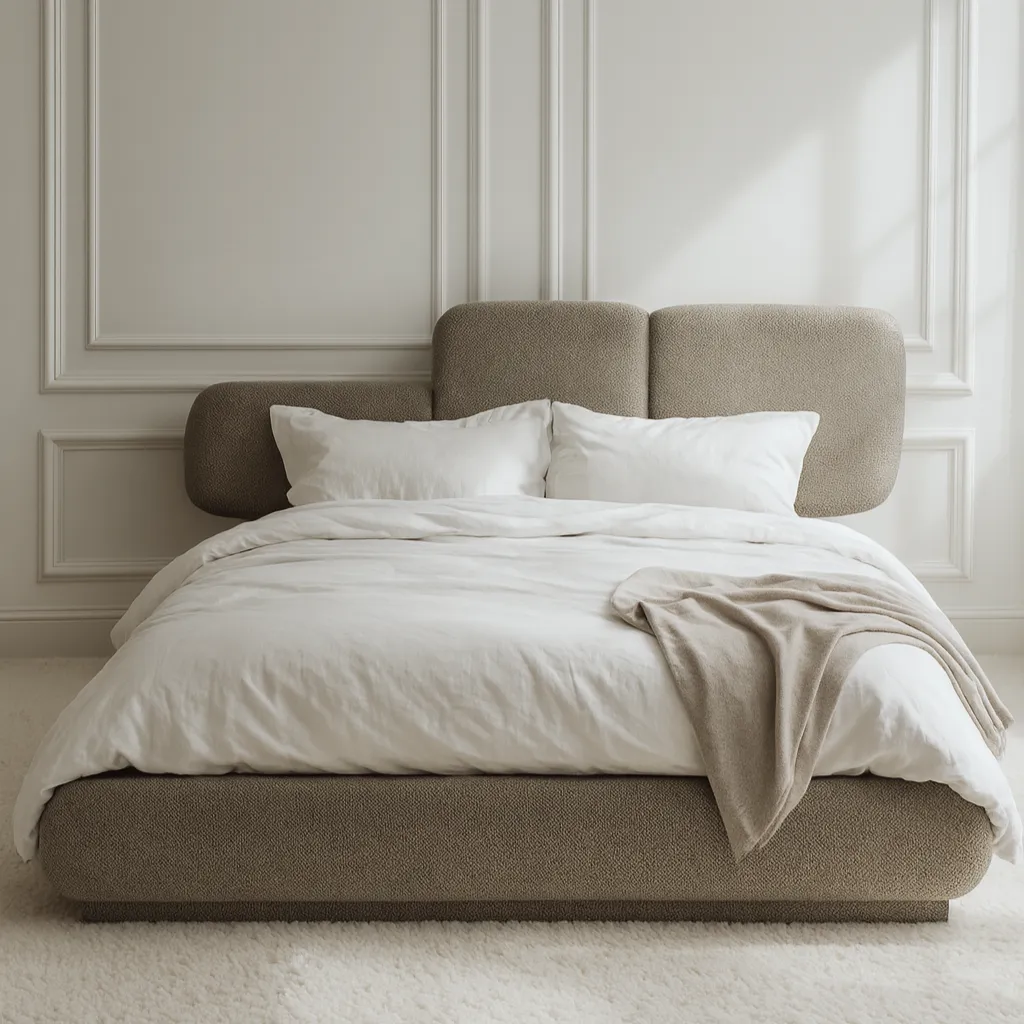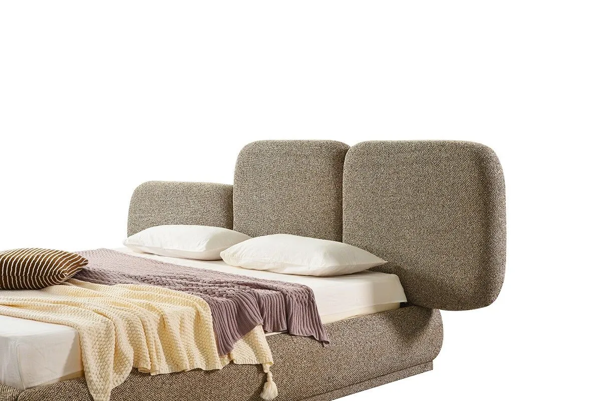 سرير أنيق بتصميم عصري، مصنوع من خامة البوليستر الفاخر مع هيكل من الخشب الصلب، بلون بني يضفي لمسة دفء وأناقة على غرفة النوم. يتميز بظهر مريح بتصميم منجد يضيف إحساسًا بالفخامة والراحة.