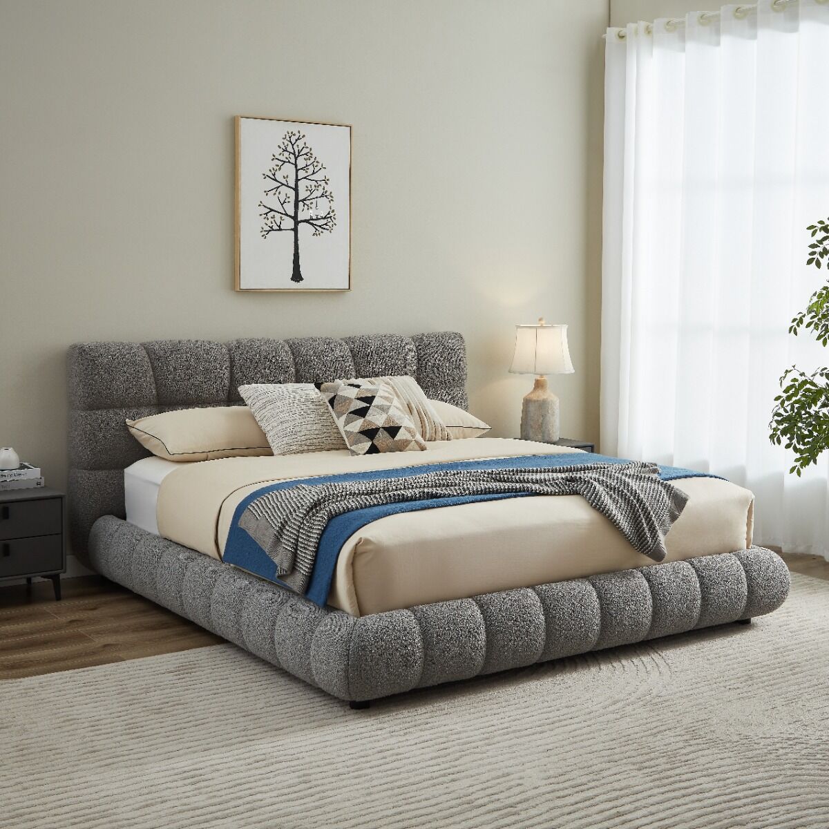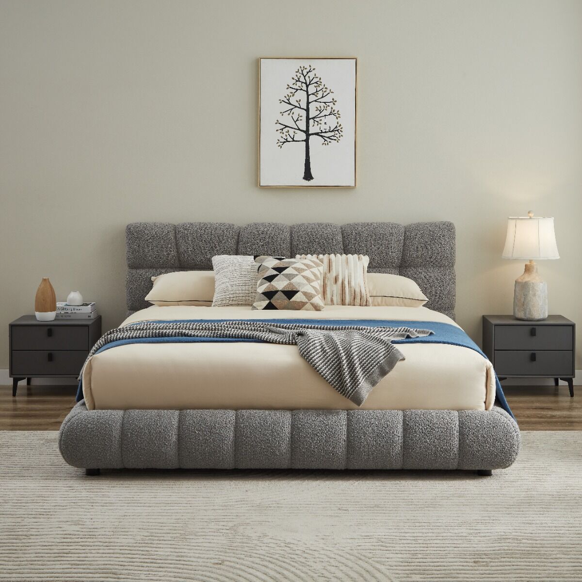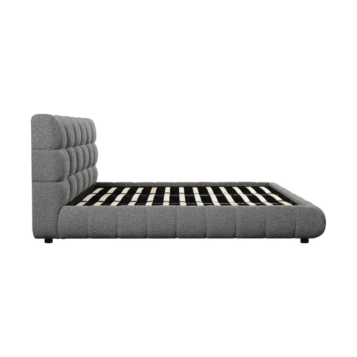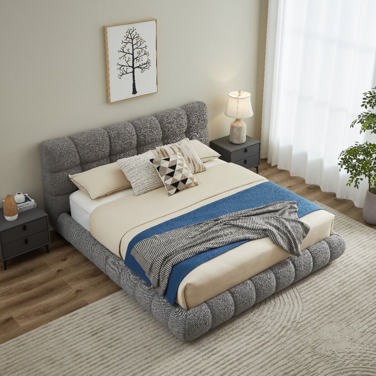 سرير كينغ رمادي فاخر بتنجيد بوكليه – تصميم عصري وراحة استثنائية