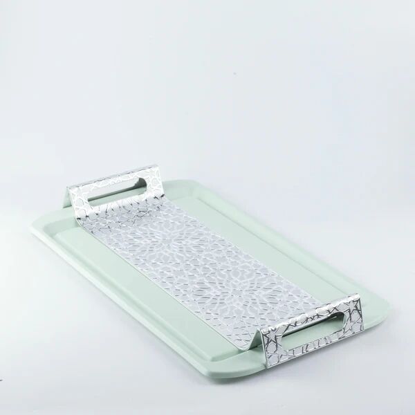 صينية تقديم فاخرة بتصميم عصري وأنيق تجمع بين الجمال والعملية، حيث تتميز بحواف معدنية مذهّبة تضيف لمسة من الفخامة، وأربع نواحٍ بتصميم مميز يعكس الحداثة والرقي، كما تكتمل أناقتها بمقبضين عمليين يسهّلان حملها وتقديم الضيافة بأسلوب مميز.