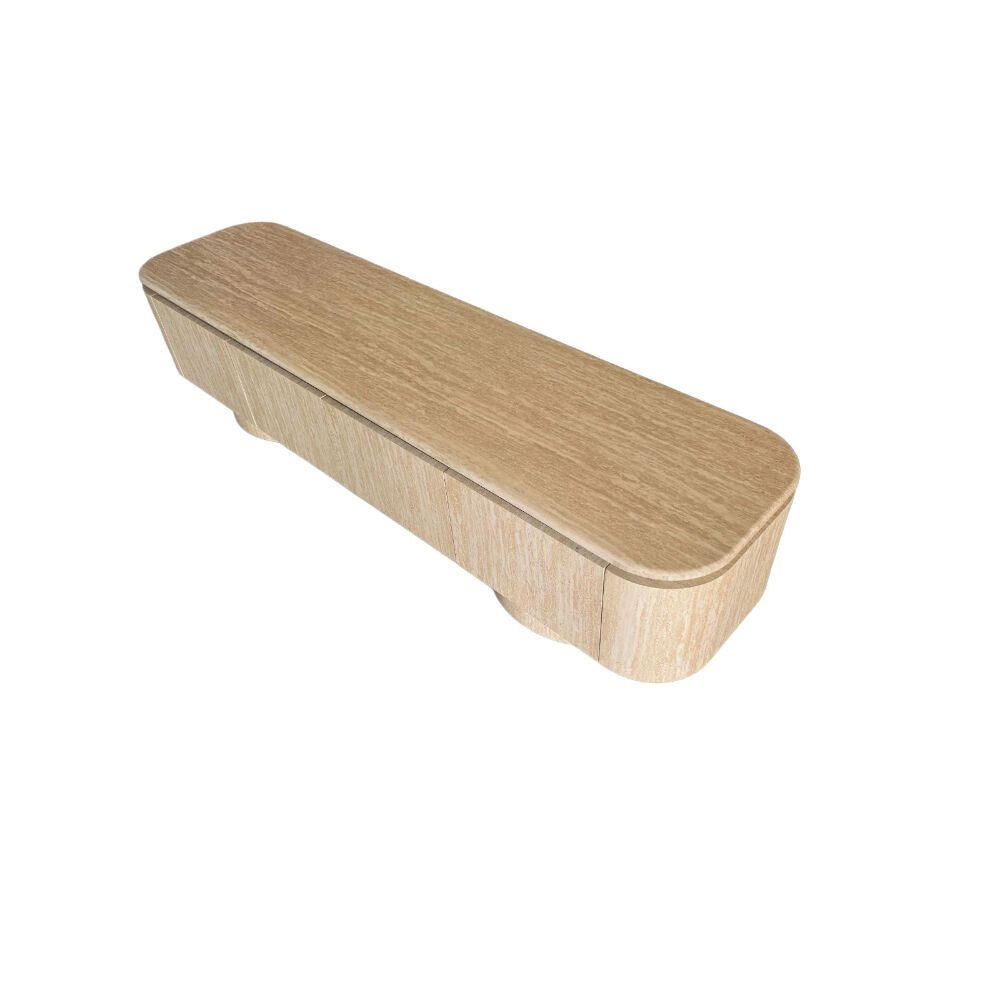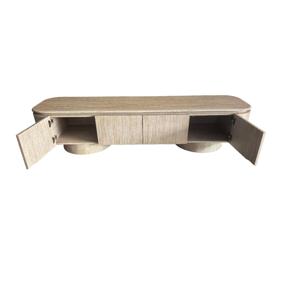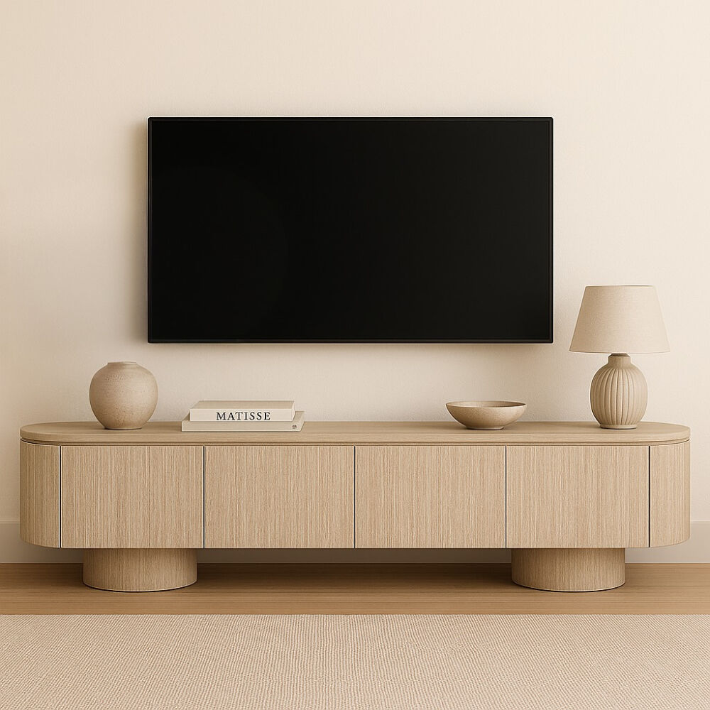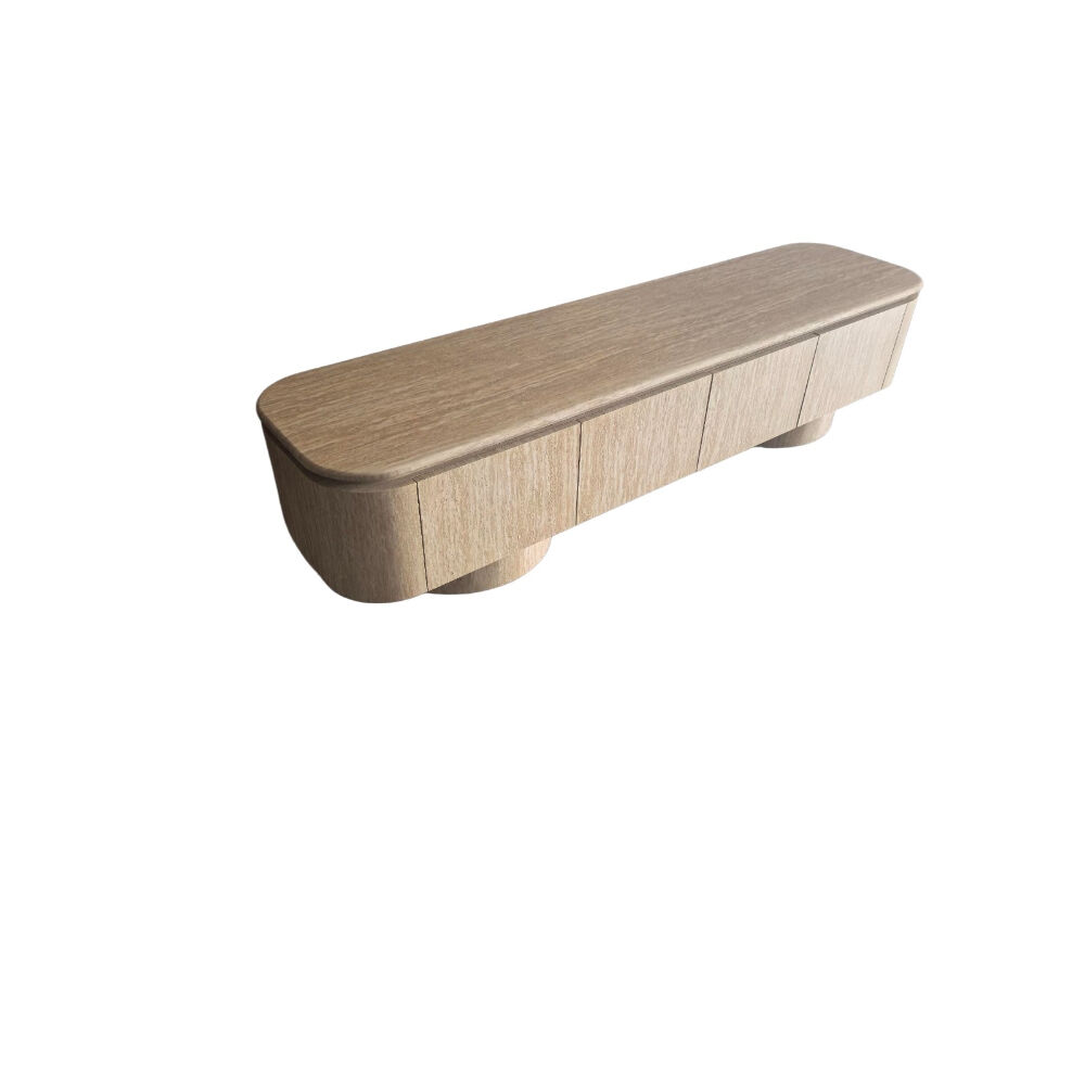 اجعل زاوية الترفيه أكثر أناقة مع هذه الوحدة الخشبية المودرن للتلفاز. تصميم انسيابي بواجهة مموّجة تضيف لمسة فنية مميزة، مع سطح علوي من الرخام الصناعي دافئ مثالي لتزيين القطعة بإكسسوارات أو نباتات. تحتوي على أبواب تخزين واسعة مع مقابض تضيف تباينًا عصريًا جذابًا. مثالية لغرف المعيشة الحديثة، وتوفر مزيجًا مثاليًا من الوظيفة والأناقة.