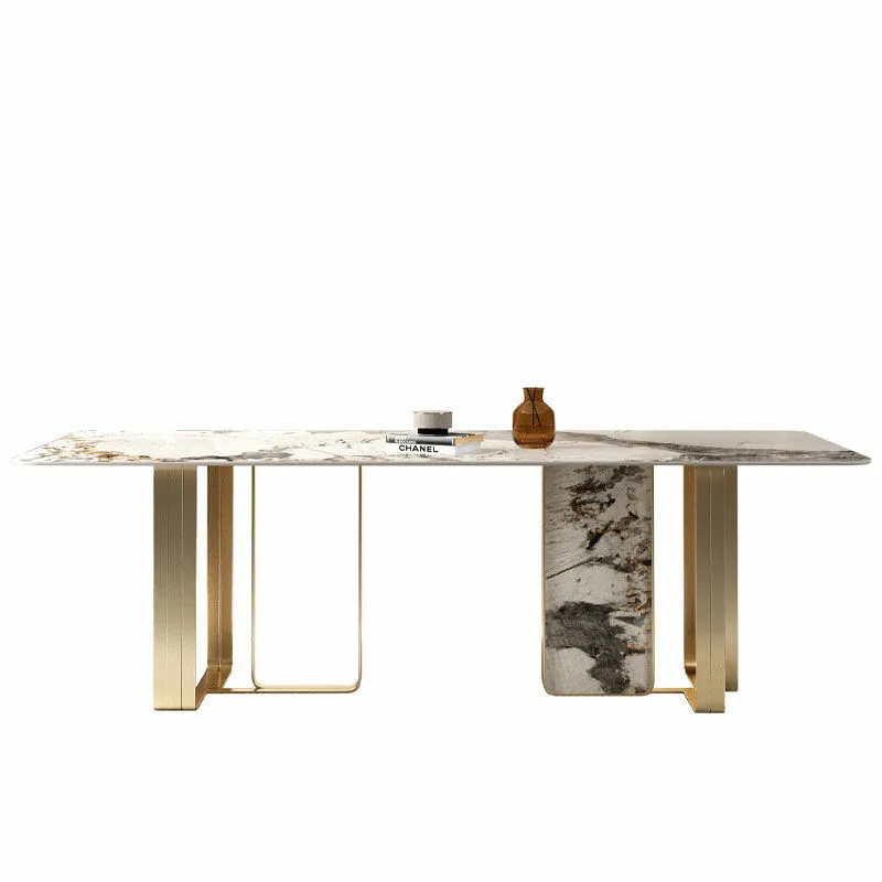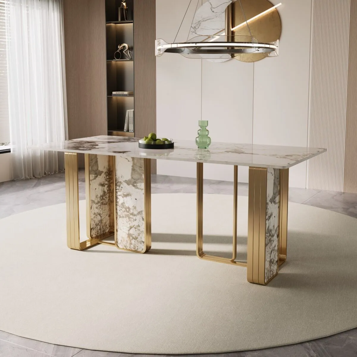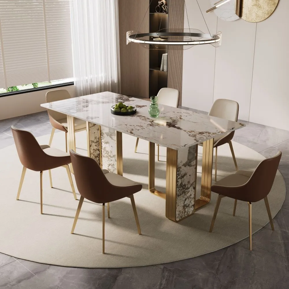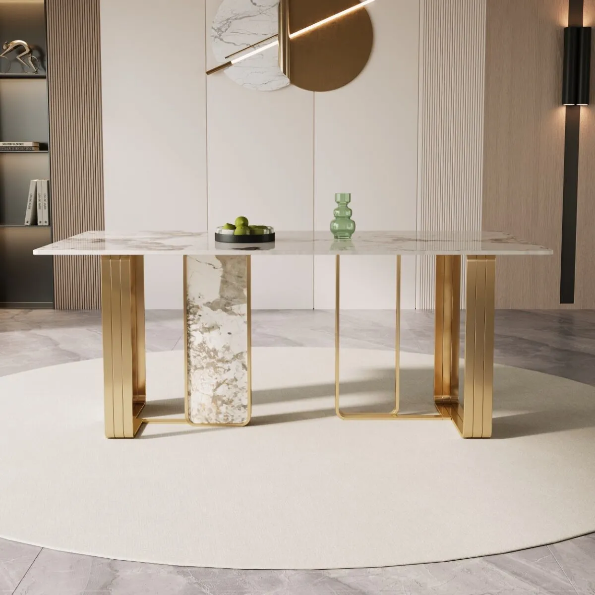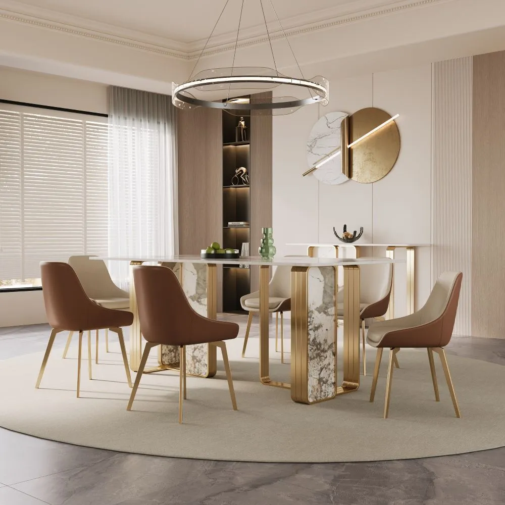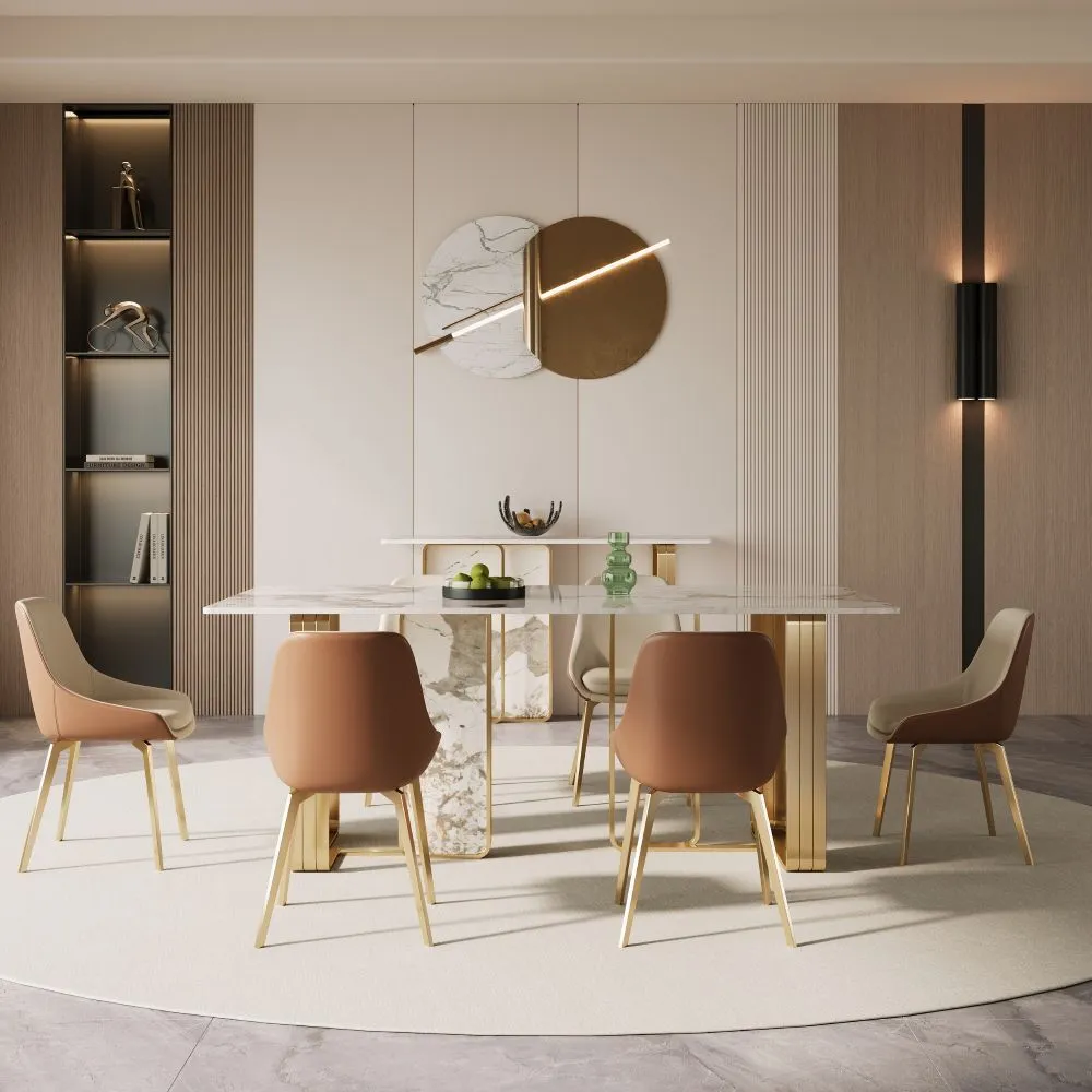 • لمسة نهائية فاخرة: اللون الأبيض مع التفاصيل الذهبية يضفيان جاذبية فريدة على غرفة الطعام.