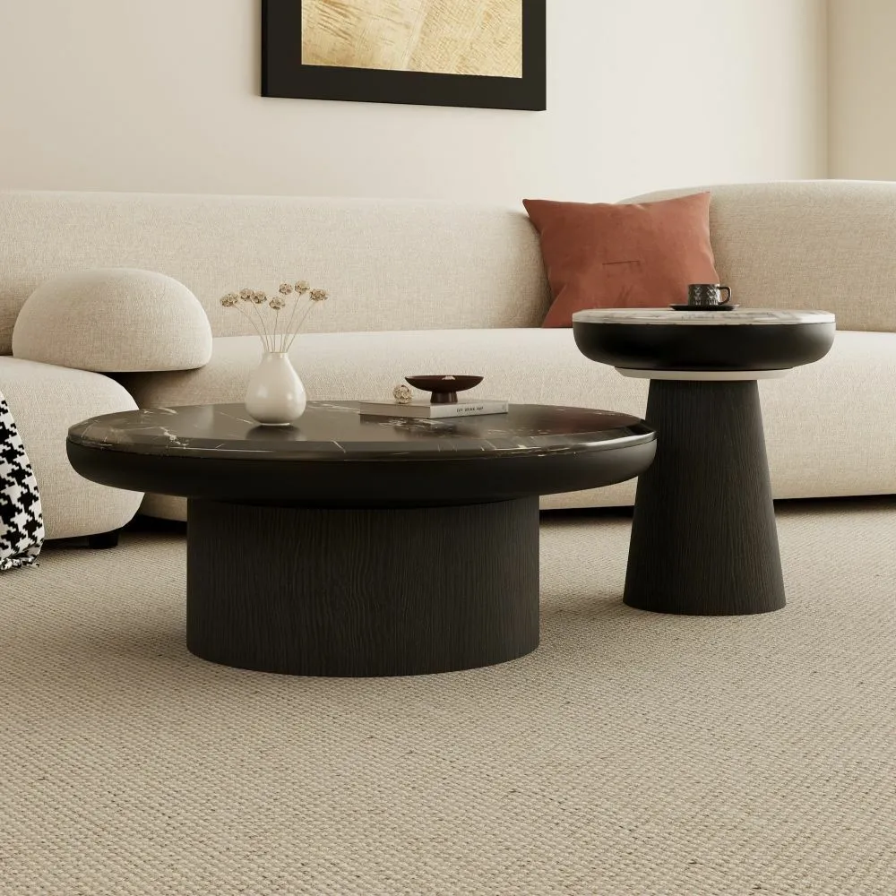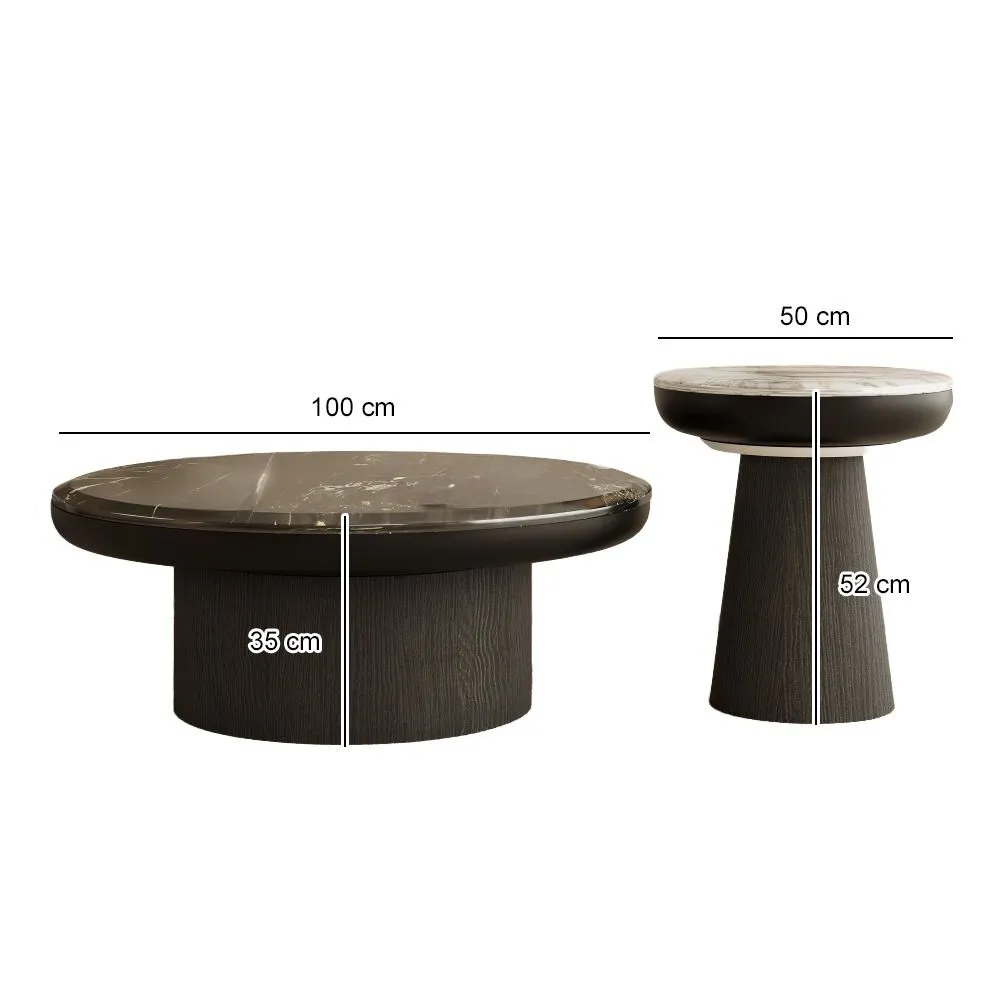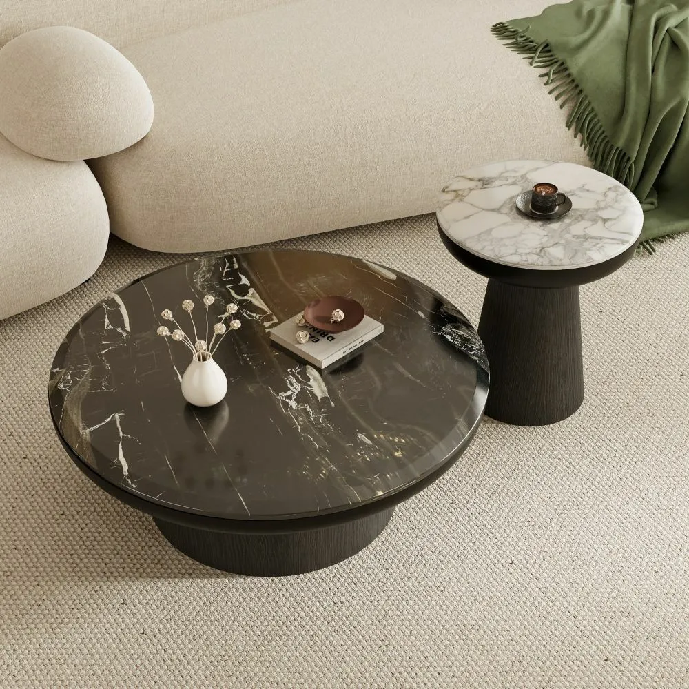 طاولتان بتصميمين مختلفين في الارتفاع، تضيفان بعدًا بصريًا مميزًا وتجعل الطقم مناسبًا للاستخدام العملي والديكوري.سطح من الرخام الفاخر: