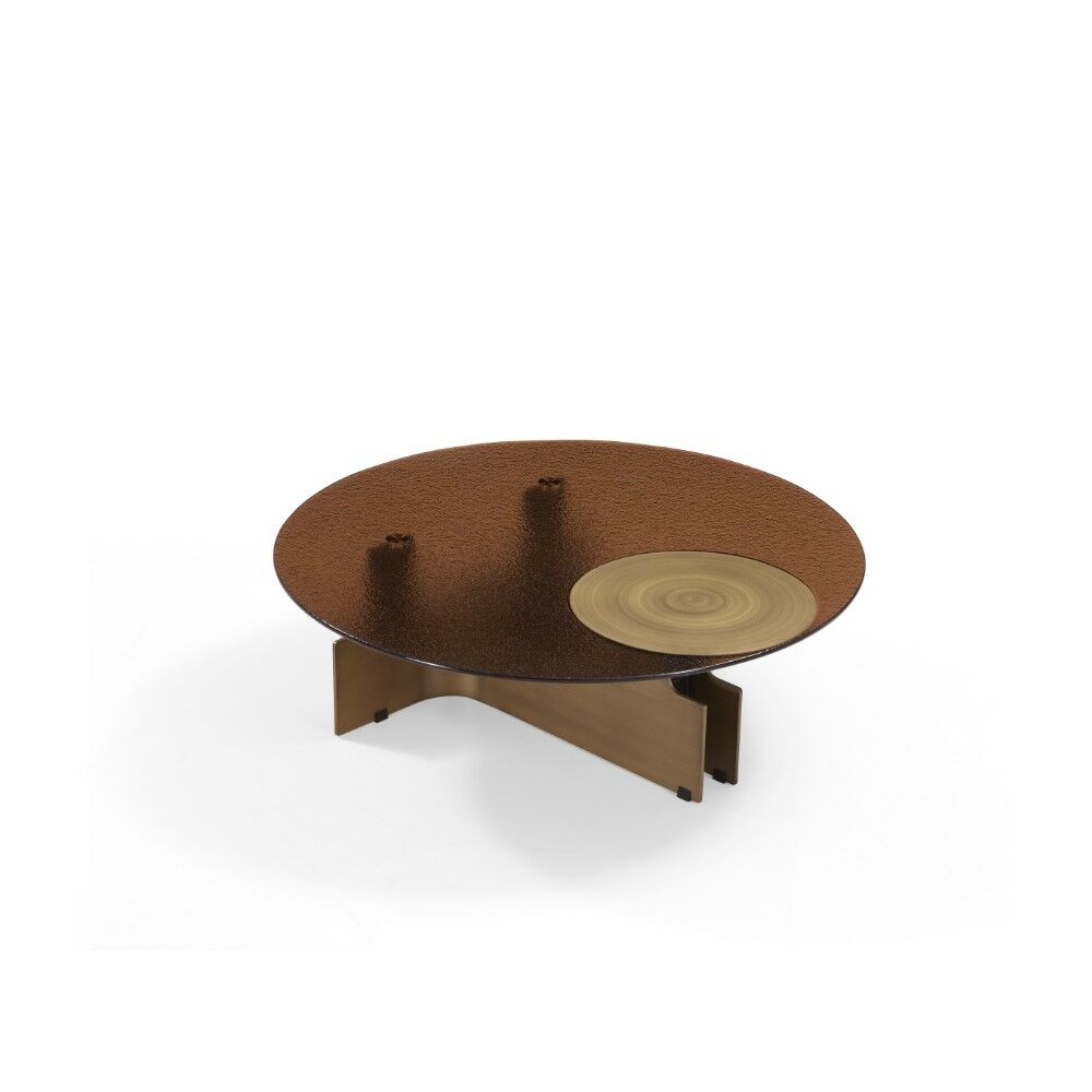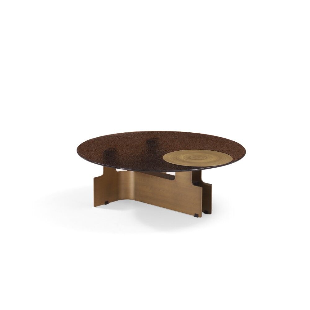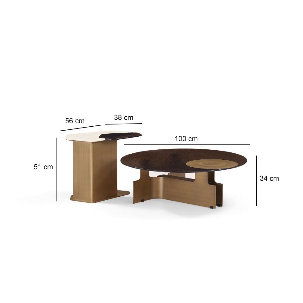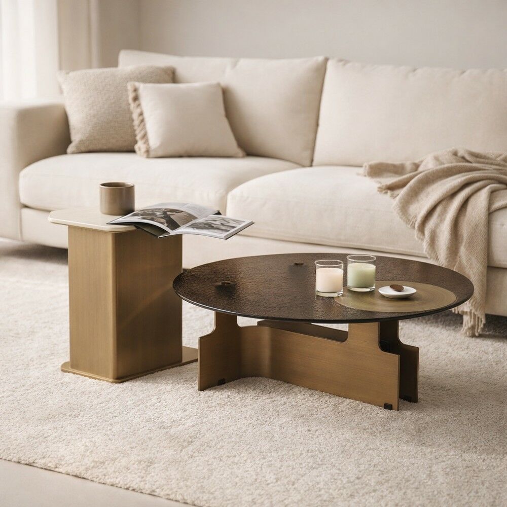 - طاولة وسط بسطح زجاج مقسّى مع صفيحة فولاذية وقاعدة برونزية مصقولة لمتانة وأناقة عالية