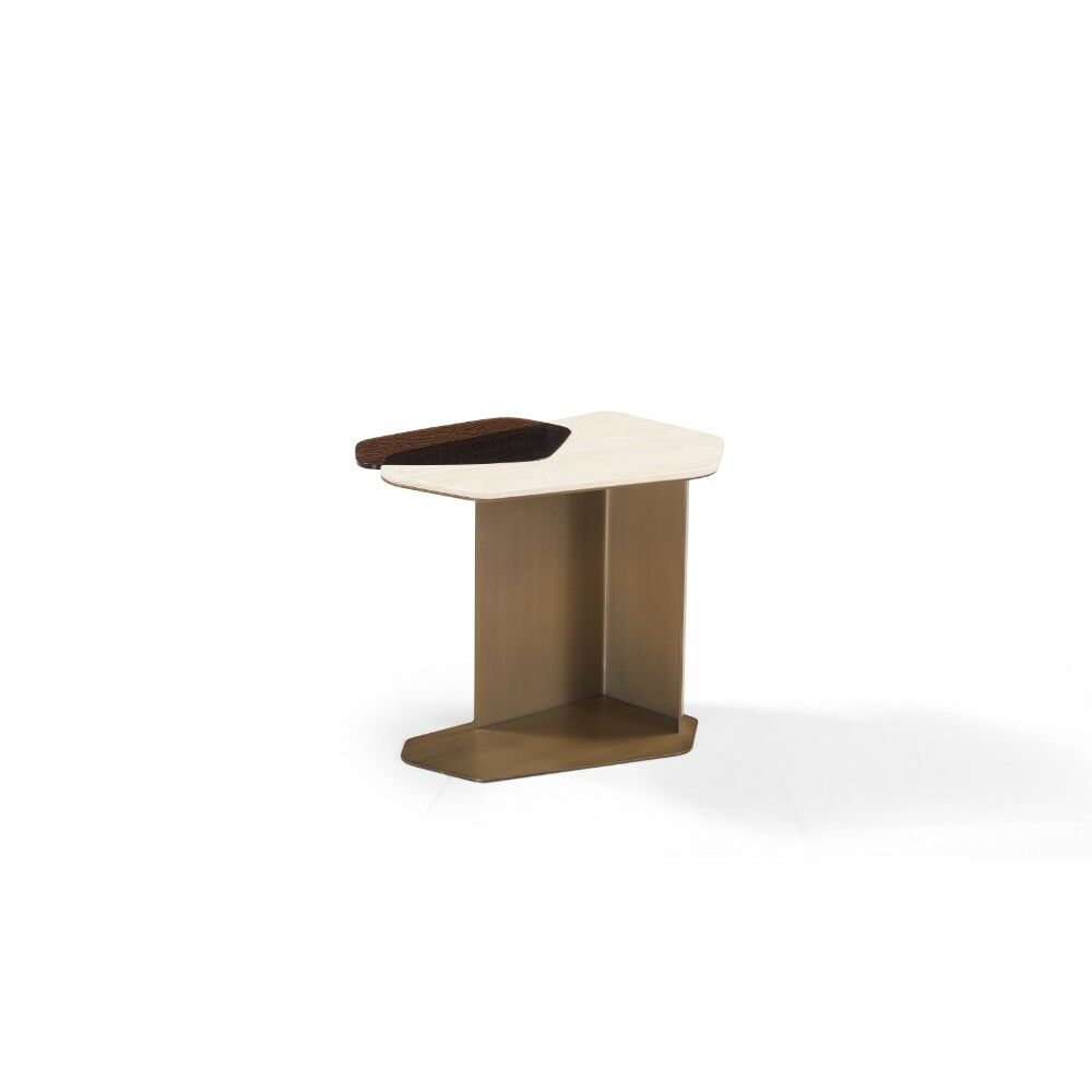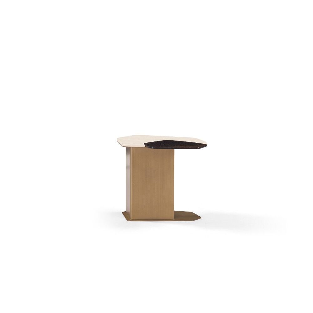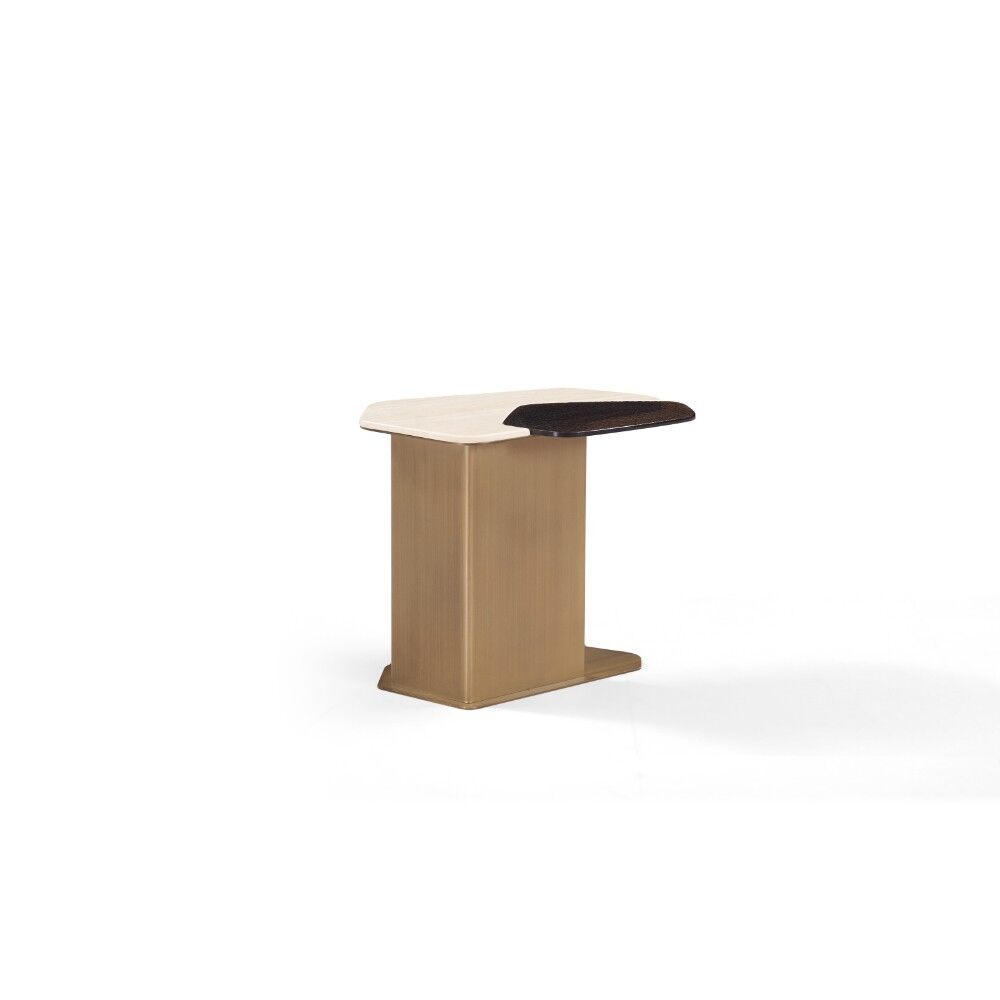 - طاولة جانبية بسطح رخامي (تشطيب حجر الكهف) مع زجاج مقسّى وقاعدة فولاذ كربوني بلمسة برونزية مصقولة