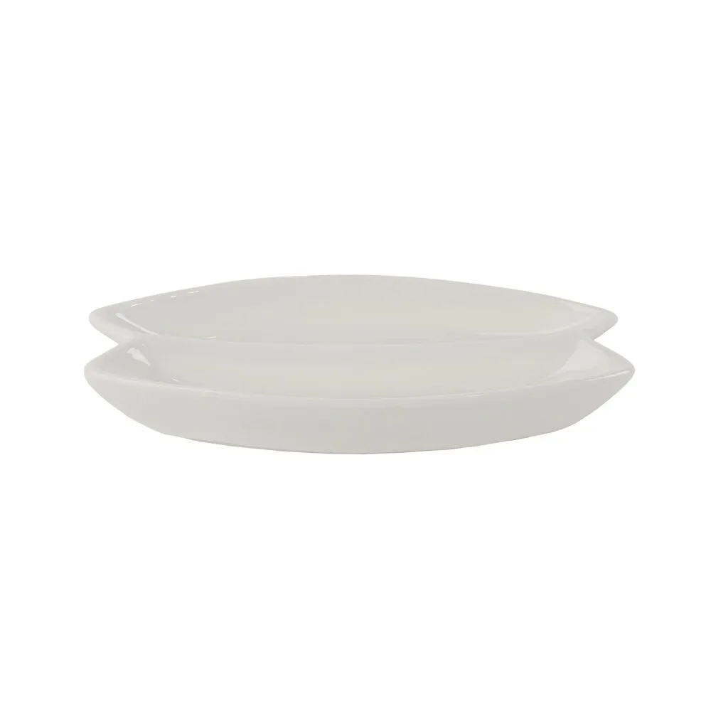 طبق تقديم مستطيل الشكل مقسم إلى قسمين مصنوع من البورسلان باللون الأبيض, مناسب لإحتواء مختلف الأصناف, إختيار مثالي لتقديم وتنسيق الأطعمة بشكل جميل ومنظم.