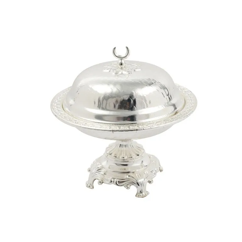 طبق تقديم بغطاء مصنوع من الحديد باللون الفضي . يمكن أن يستخدم للضيافة أو للديكور في غرفة المعيشة أو على طاولة الطعام.