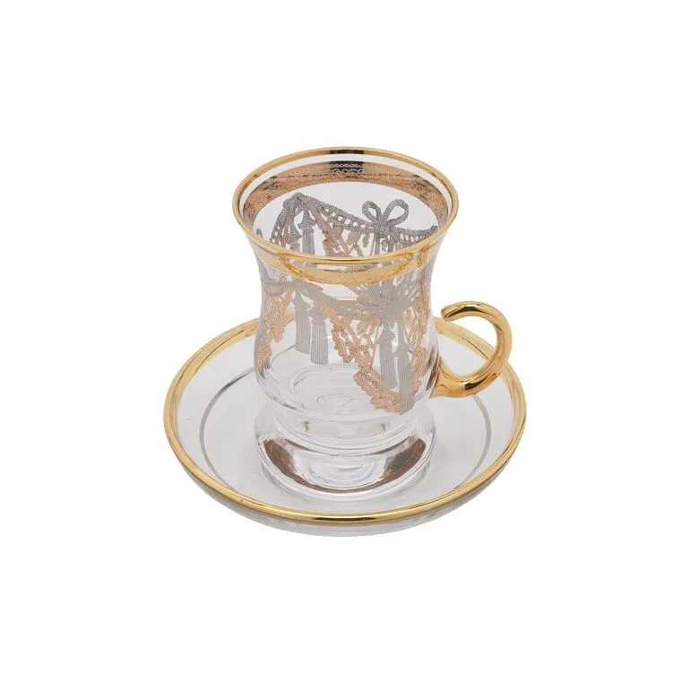 طقم من 6 فناجين شاي مصنوعة من الزجاج مزينة بنقوش ذهبية وفضية, مثالية للإستخدام اليومي أو للضيافة.