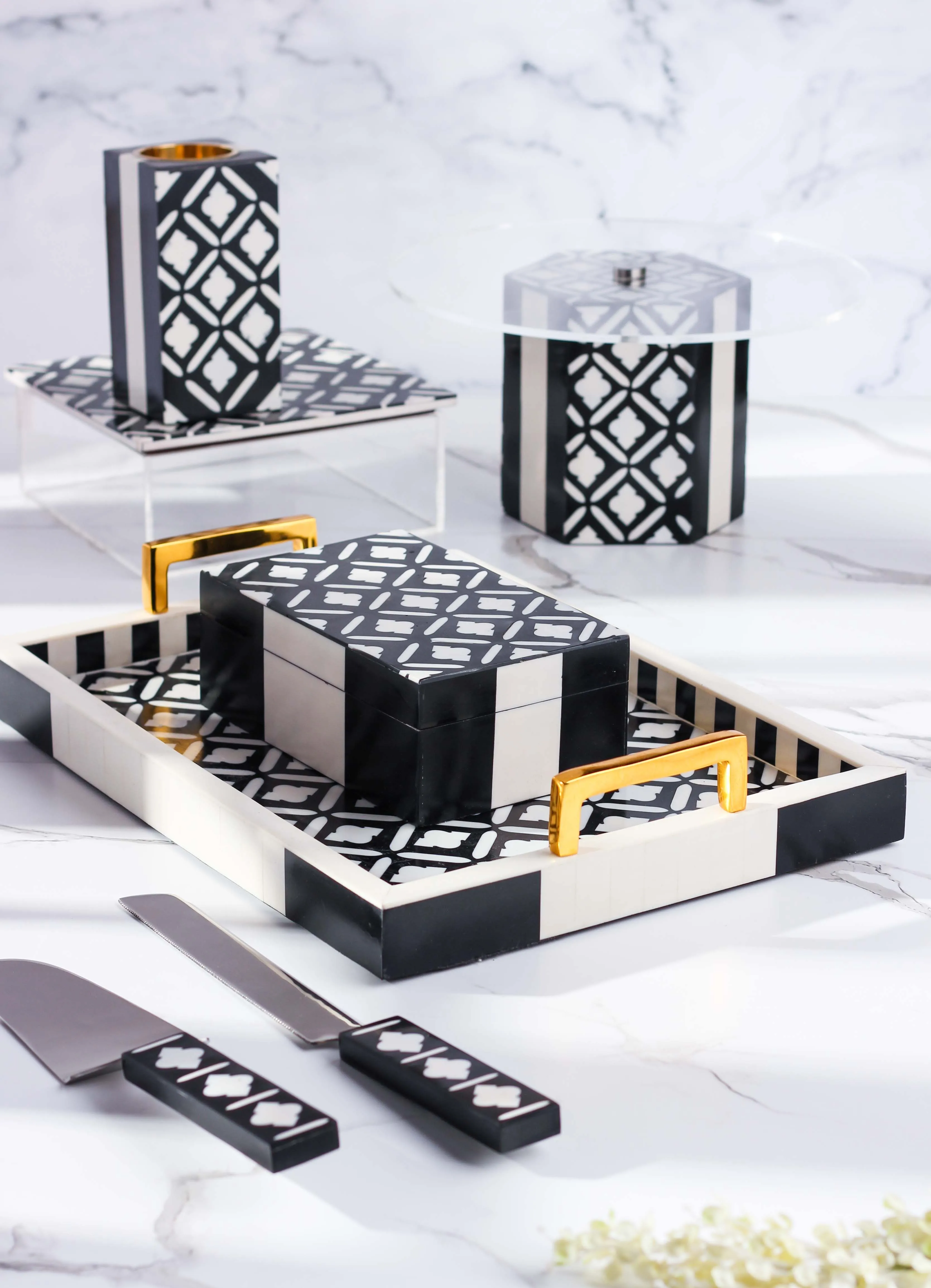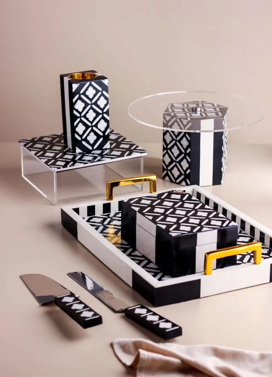 | يتضمن الطقم | صينية وصندوق تقديم وحامل كيك مع سكين وملعقة لحمل الكيك ومبخرة وصندوق للبخور |