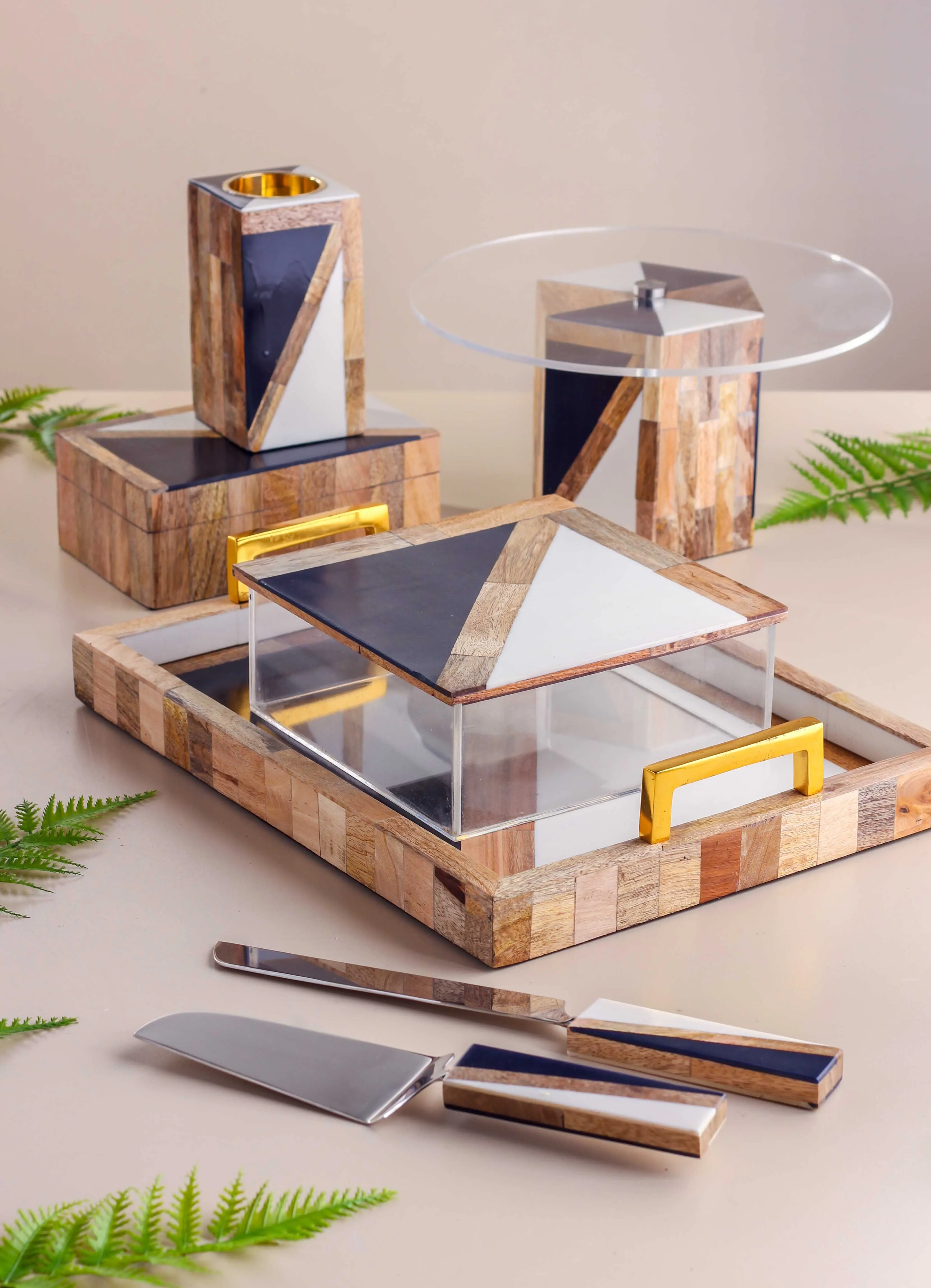 | يتضمن الطقم | صينية وصندوق تقديم وحامل كيك مع سكين وملعقة لحمل الكيك ومبخرة وصندوق للبخور |