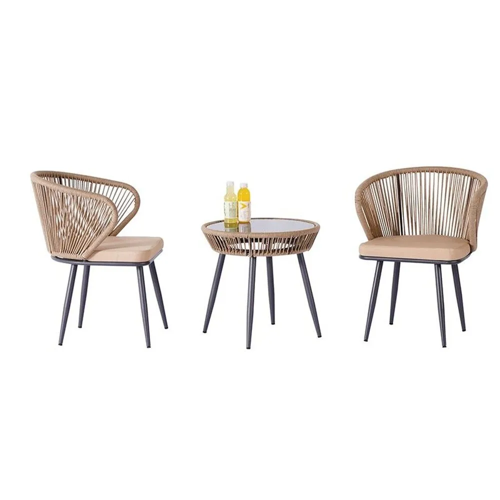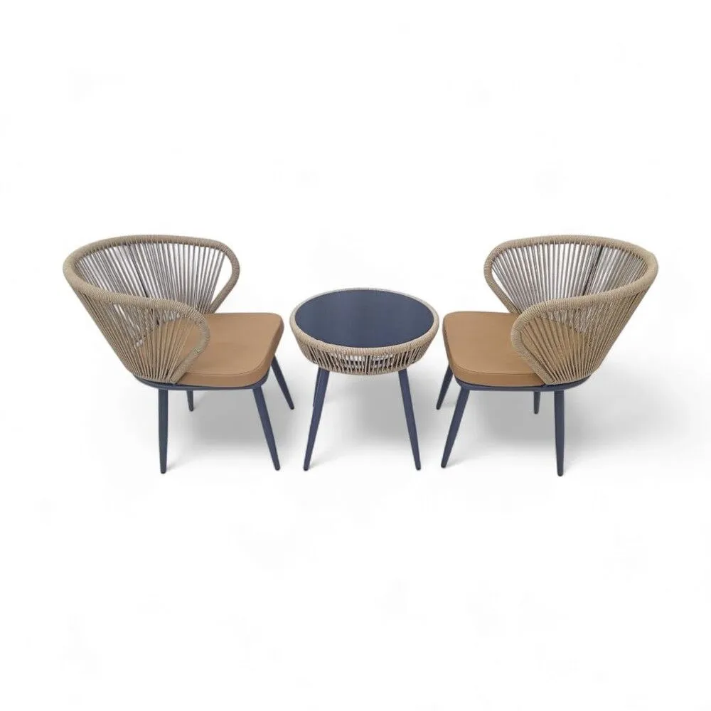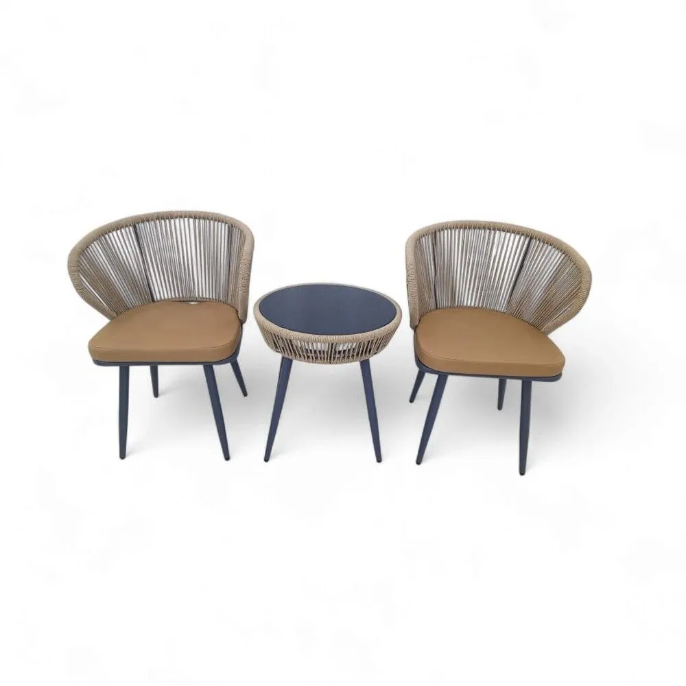 جلسة خارجية أنيقة تتكون من كرسيين مريحين وطاولة صغيرة، تصميم عصري ومثالي للمساحات الداخلية والخارجية. مثالية لتناول القهوة أو الاستمتاع بأوقات الراحة.