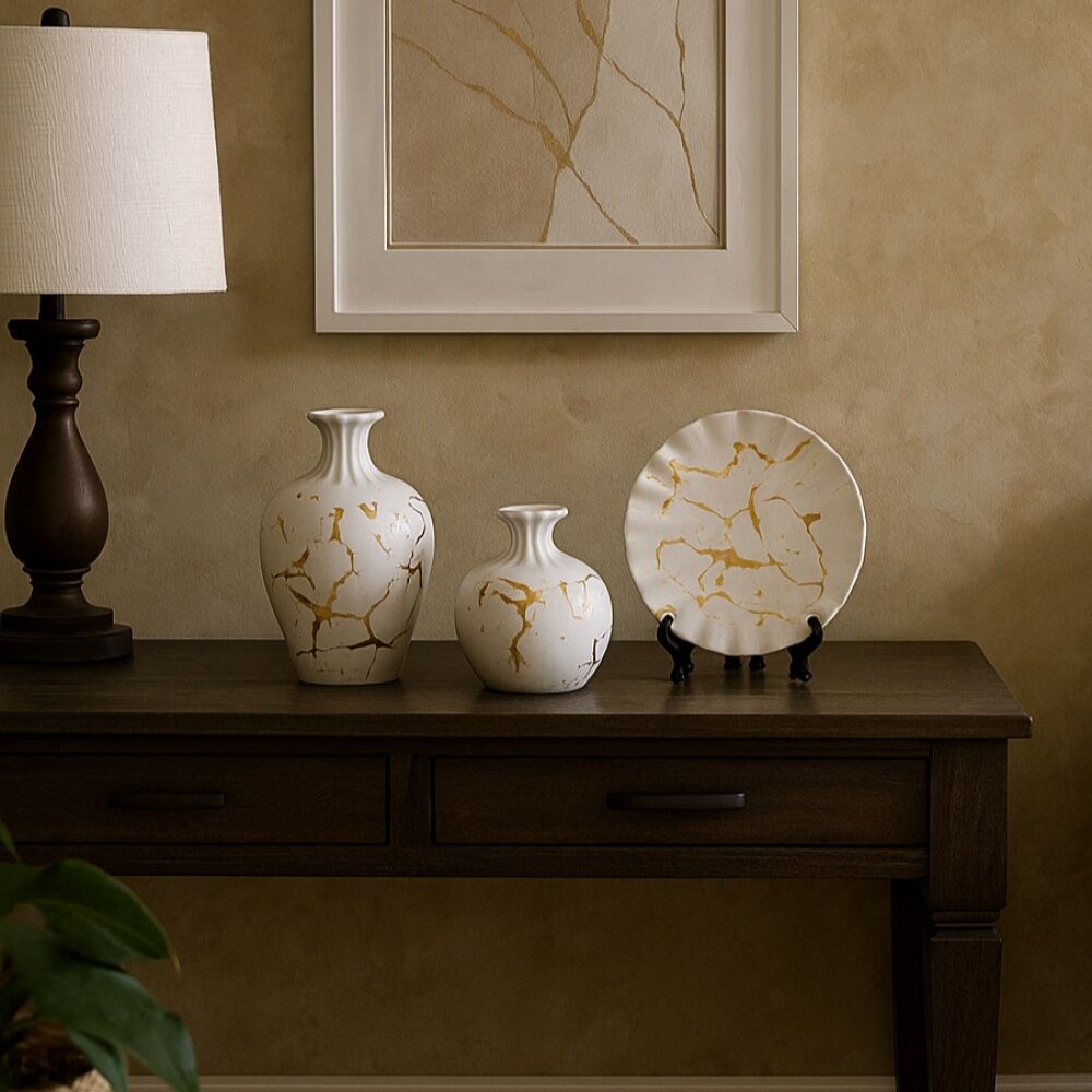 طقم ديكور سيراميك مينو - ابيض وذهبي