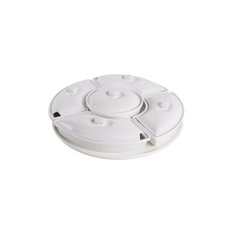 مجموعة من خمسة زبديات بأغطية مصنوعة من البورسلان باللون الأبيض و ذو عمق مناسب لإحتواء مختلف الأصناف وهو إختيار مثالي لتقديم وتنسيق الأطعمة بشكل جميل ومنظم.