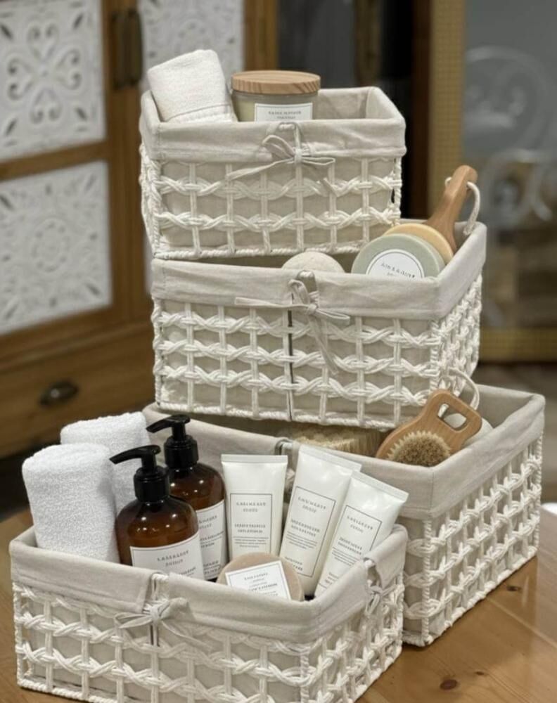 طقم سلال تخزين يدوي تولاي يتألف من أربع قطع بأحجام مختلفة، مصمم بعناية ليجمع بين الأناقة والعملية والجودة العالية. كل سلة مصنوعة يدويًا من خامات متينة وتشطيب متقن، مع قاعدة قوية وجوانب متماسكة لتتحمل الاستخدام اليومي. مبطنة من الداخل بقماش ناعم لحماية المحتويات وتنظيمها بطريقة أنيقة، كما تحتوي على فواصل تساعد على ترتيب الأغراض بشكل مرتب وجذاب. هذه السلال مناسبة لتنظيم مستلزمات العناية الشخصية، ترتيب أغراض غرفة النوم أو المعيشة أو المدخل، وتقديم الهدايا بطريقة فاخرة. بالإضافة إلى كونها تضيف لمسة ديكورية راقية للمكان، فهي خفيفة وسهلة النقل ومثالية للاستخدام المنزلي أو التجاري. يأتي الطقم بأحجام متنوعة لتلبية جميع الاحتياجات.