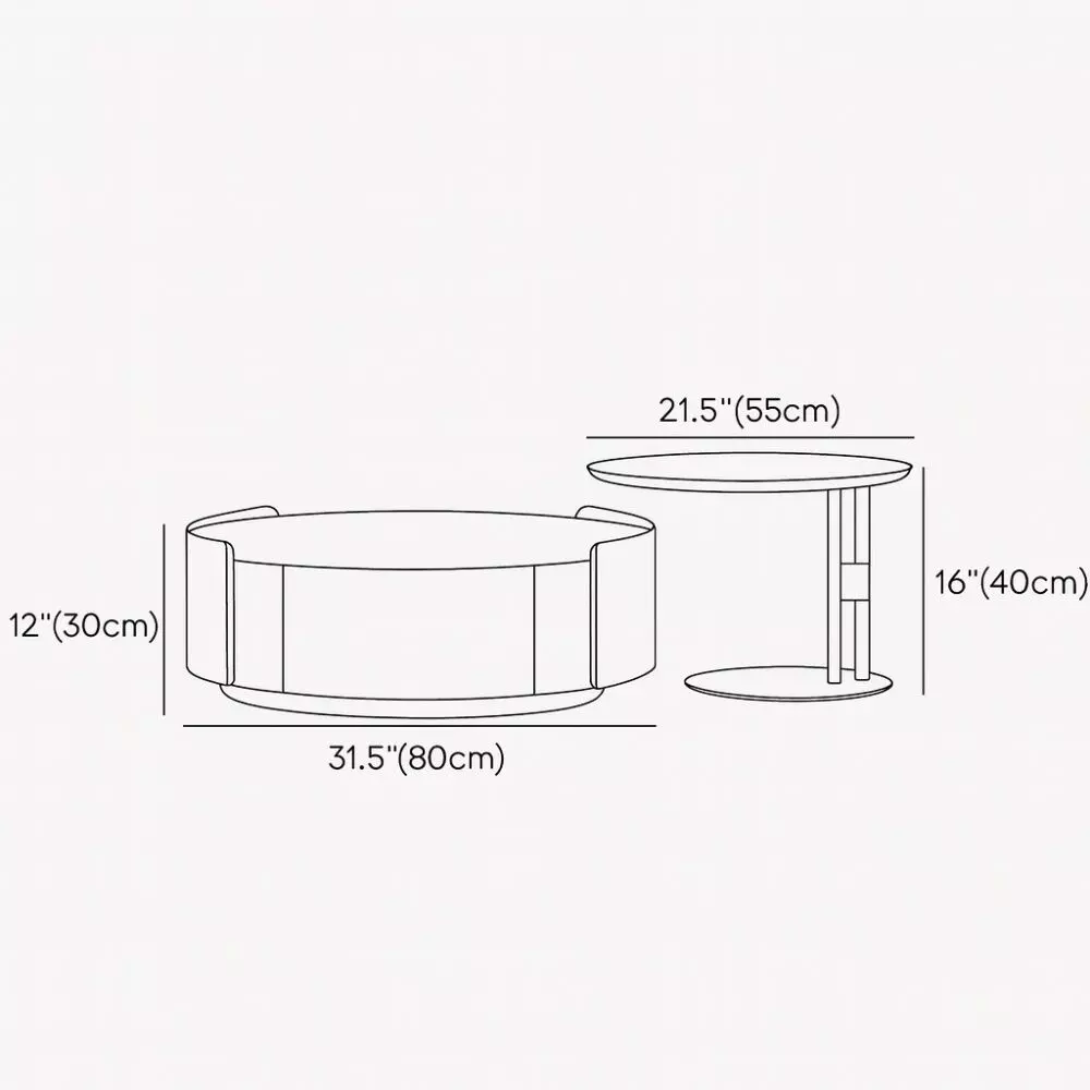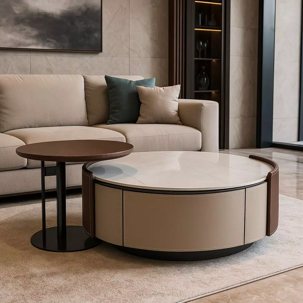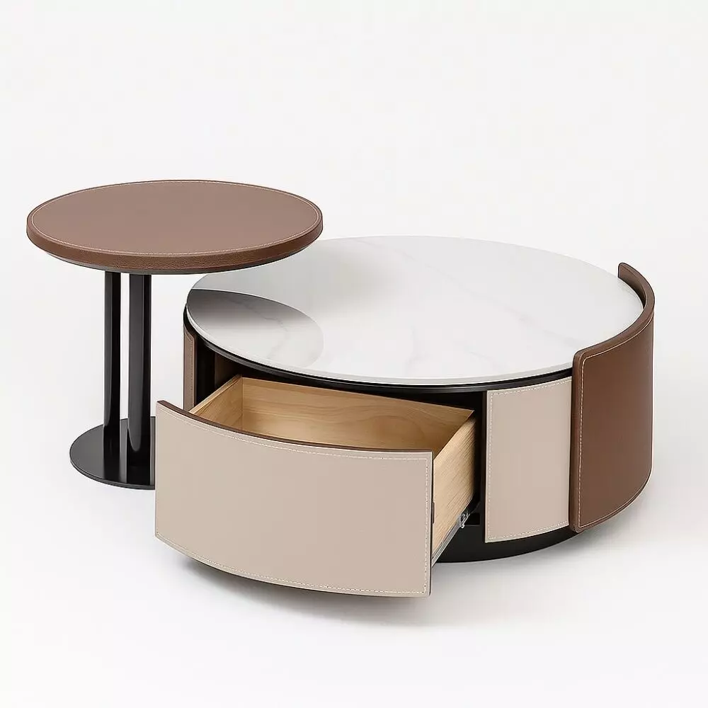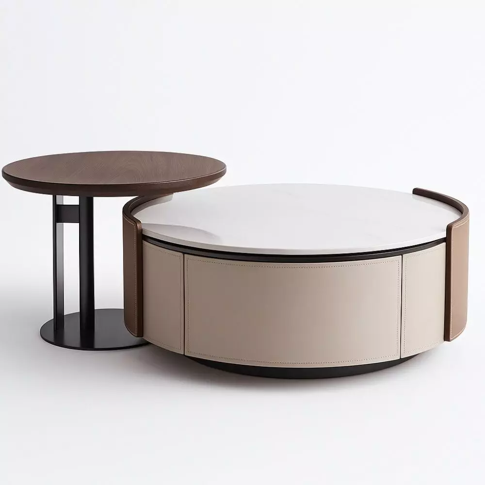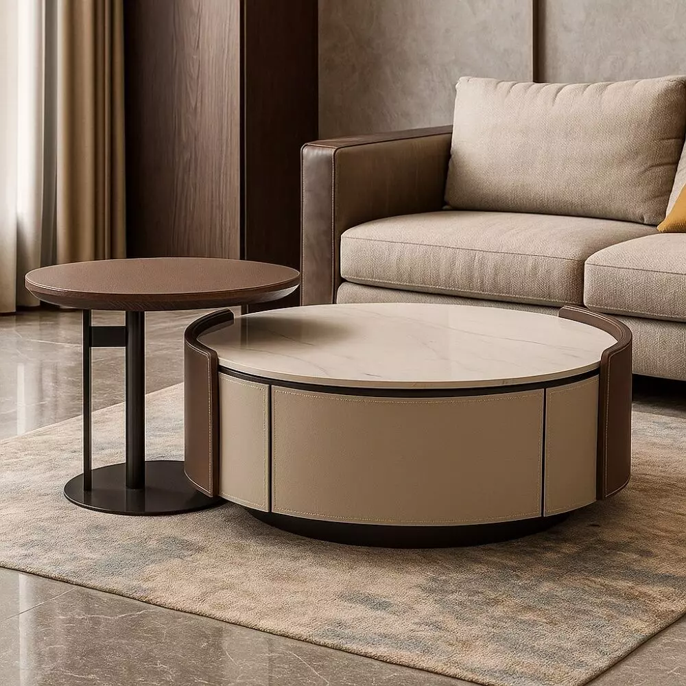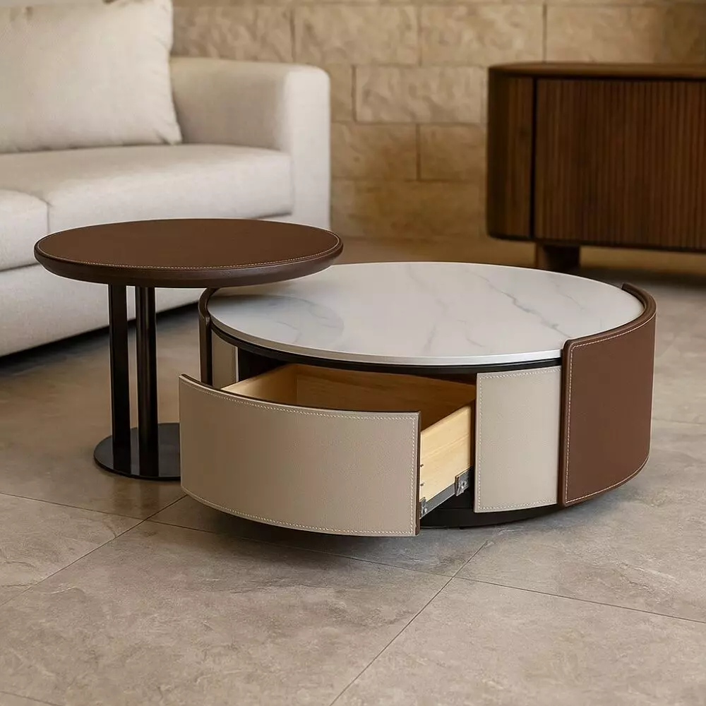 طقم طاولة قهوة فاخر بتصميم عصري يجمع بين الجلد والمعدن بلمسة راقية وأنيقة.تتجانس ألوان الطقم بين سطح طاولة القهوة الابيض مع تفاصيل مميزة باللون البيج و لون بني دافئ يغطي سطح الطاولة الجانبية لتندمج ألوان الطقم وتبرز لوحة فنية فخمة تزين غرفة معيشتك