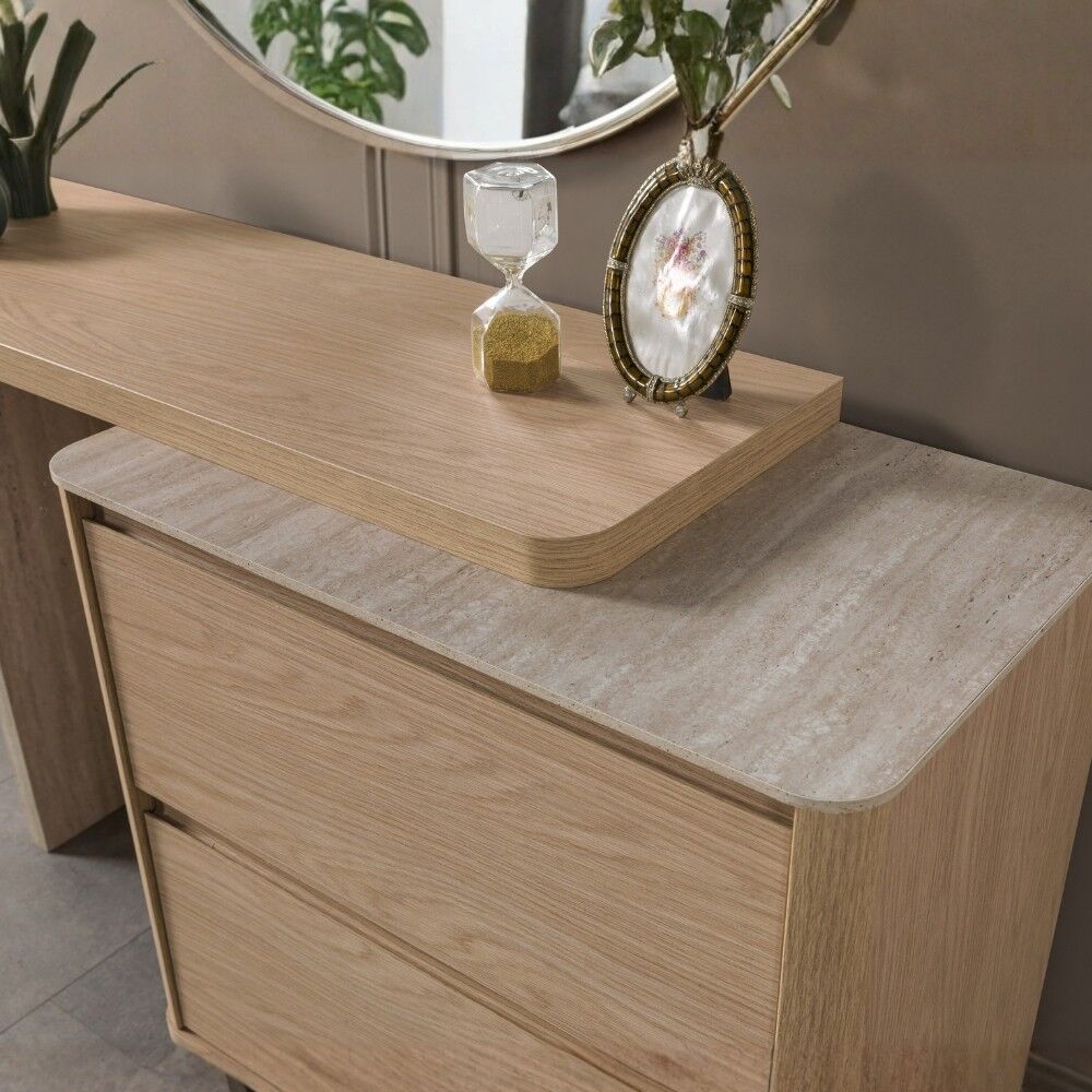 مصنوع من خشب MDF متين، يوفّر استخداماً عملياً ويضيف لمسة أنيقة بجانب السرير.التسريحة: