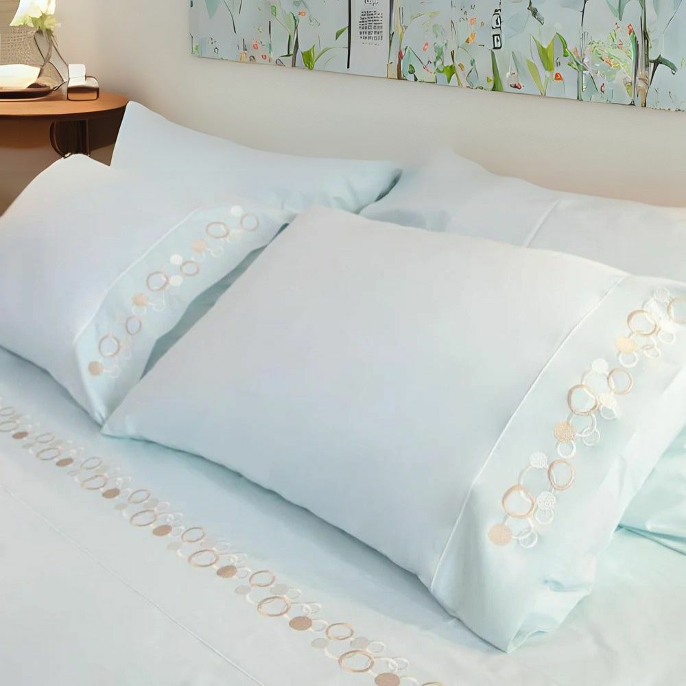 | يتضمن الطقم | 2 غطاء وسادة مطرز 2 غطاء وسادة ساده 1 شرشف سرير مطرز 1 ملاية سرير |