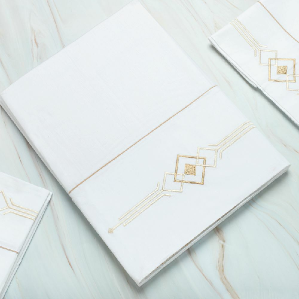 | يتضمن الطقم | 2 غطاء وسادة مطرز 2 غطاء وسادة ساده 1 شرشف سرير مطرز 1 ملاية سرير |