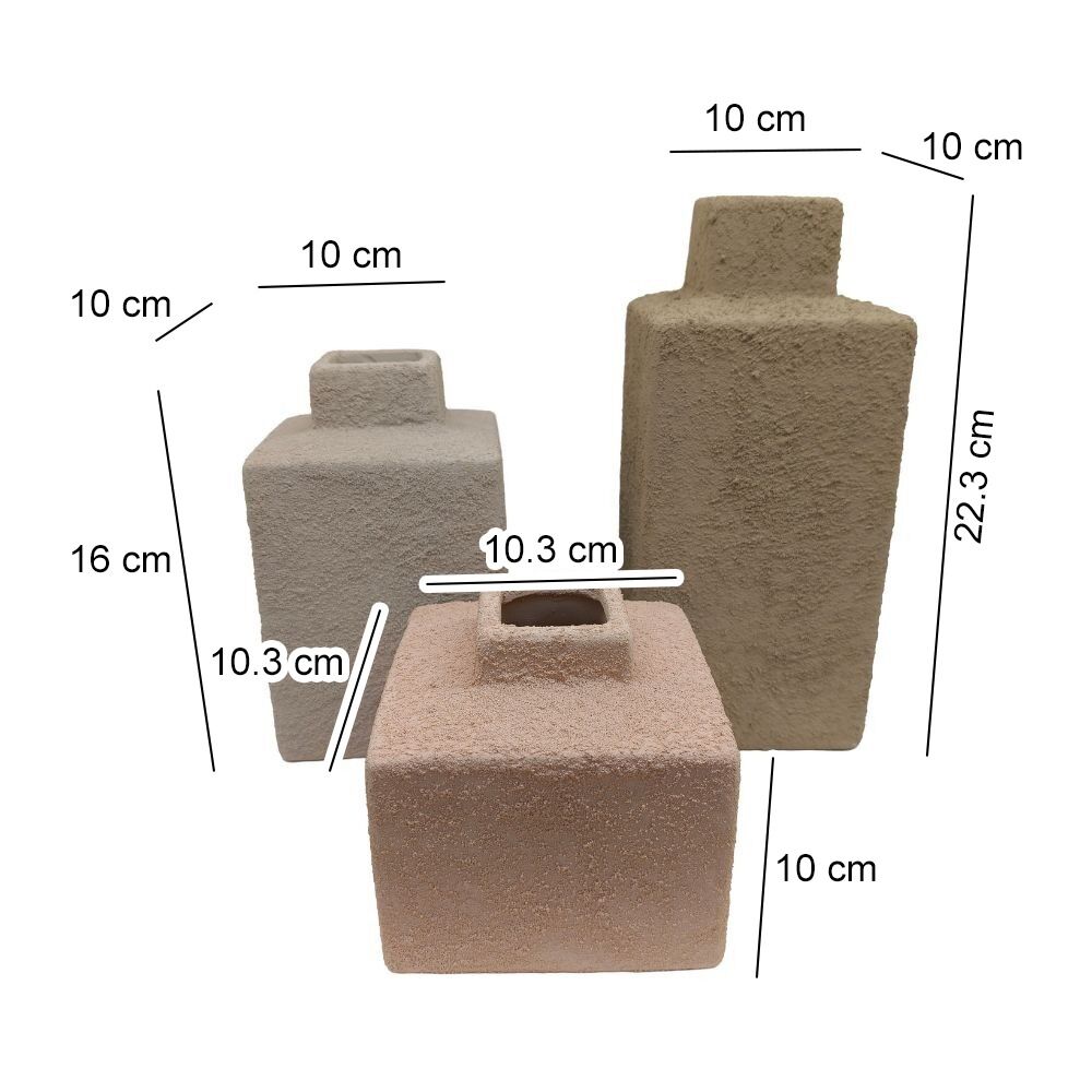 | أبعاد المنتج | ابعاد الفازة الكبيرة العرض 10 - العمق 10 - الارتفاع 22.3 سم ابعاد الفازة الوسط العرض 10 - العمق 10 - الارتفاع 16 سم ابعاد الفازة الصغيرة العرض 10.3 - العمق 10.3 - الارتفاع 10 سم |