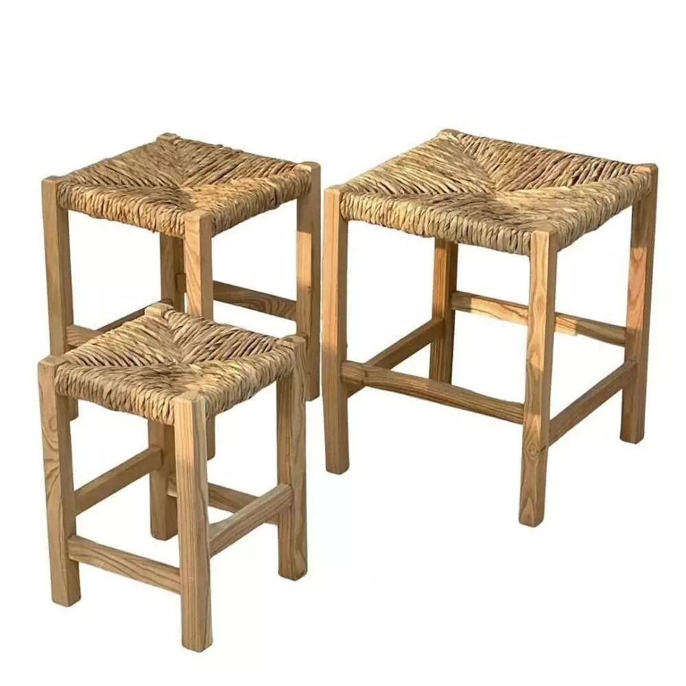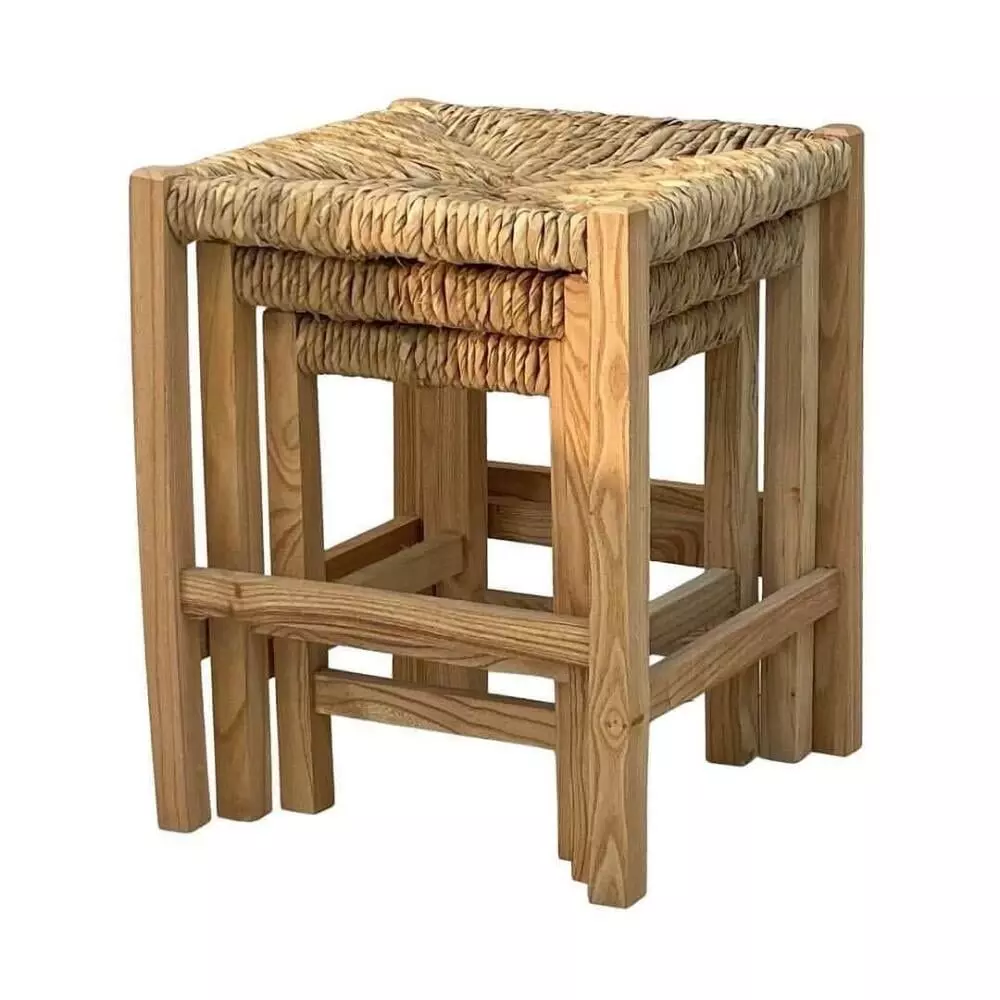 طقم مقاعد أنيق من الخشب مع لمسات القش اليدوية، يتكون من ثلاث قطع بمقاسات مختلفة تناسب جميع المساحات. تصميم عصري يجمع بين البساطة والدفء، مثالي للديكور الداخلي أو الجلسات الخارجية. متين، عملي، ويضيف لمسة طبيعية راقية لأي مكان.