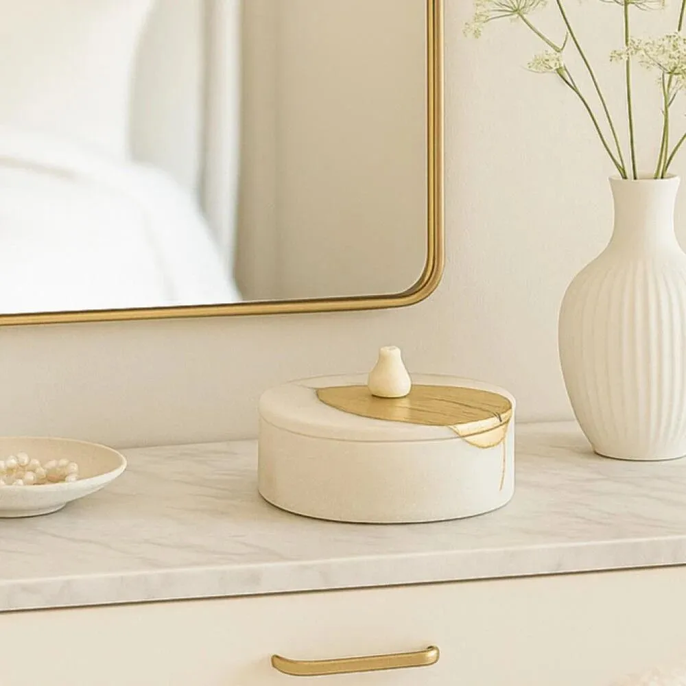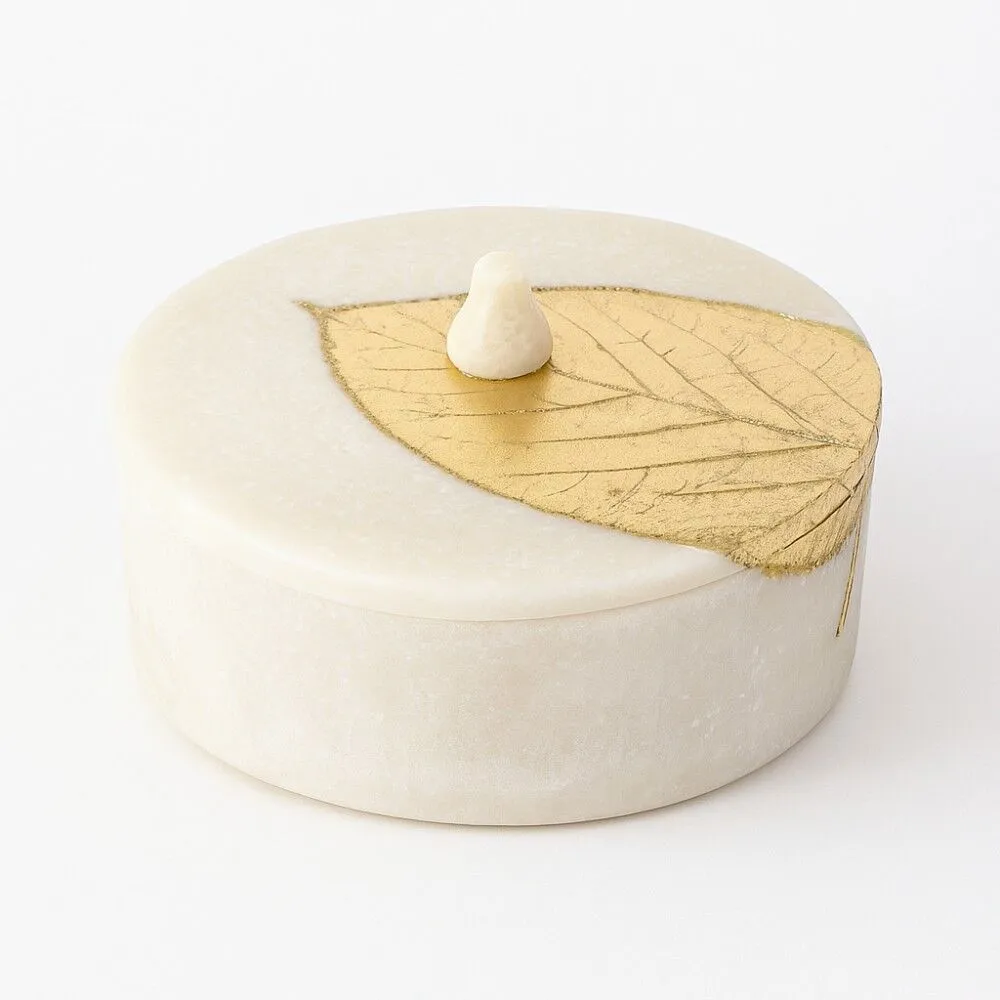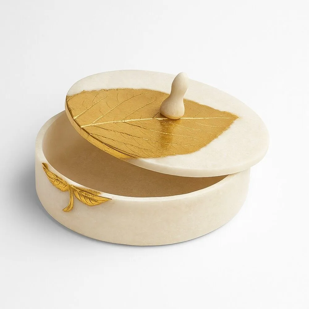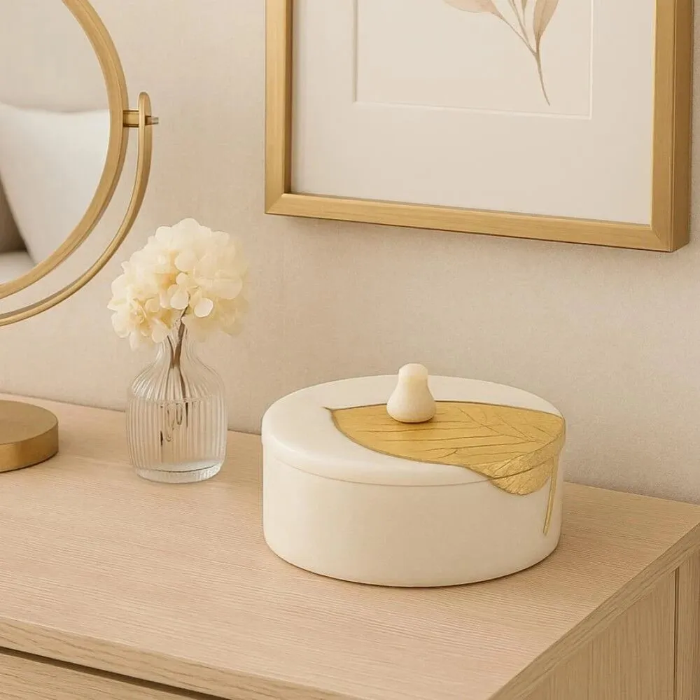 علبة ديكورية صغيرة فاخره مصنوعة من الريزن بلون بيج مع تفاصيل ذهبية لامعة على الغطاء. يتميز الغطاء بتصميم مزخرف على شكل ورقة ذهبية، مما يضيف لمسة أنيقة وفاخرة للمنتج. مادة الريزن تمنح العلبة متانة وسهولة في العناية، مما يجعلها مناسبة للاستخدام اليومي أو كقطعة ديكور فريدة. تعد هذه العلبة مثالية لتخزين المجوهرات أو استخدامها كلمسة أنيقة في أي مساحة داخلية.