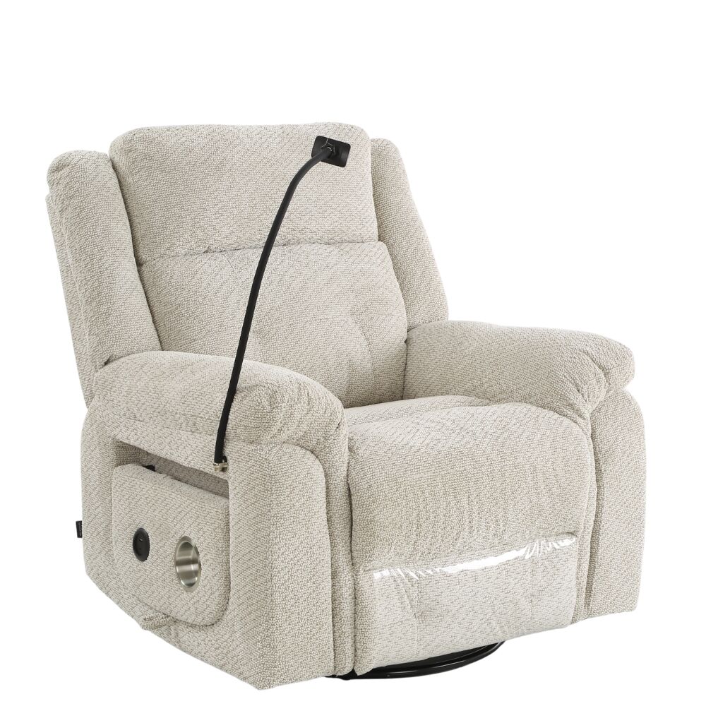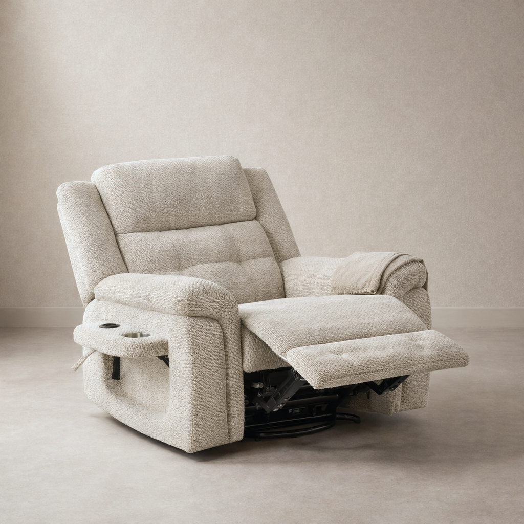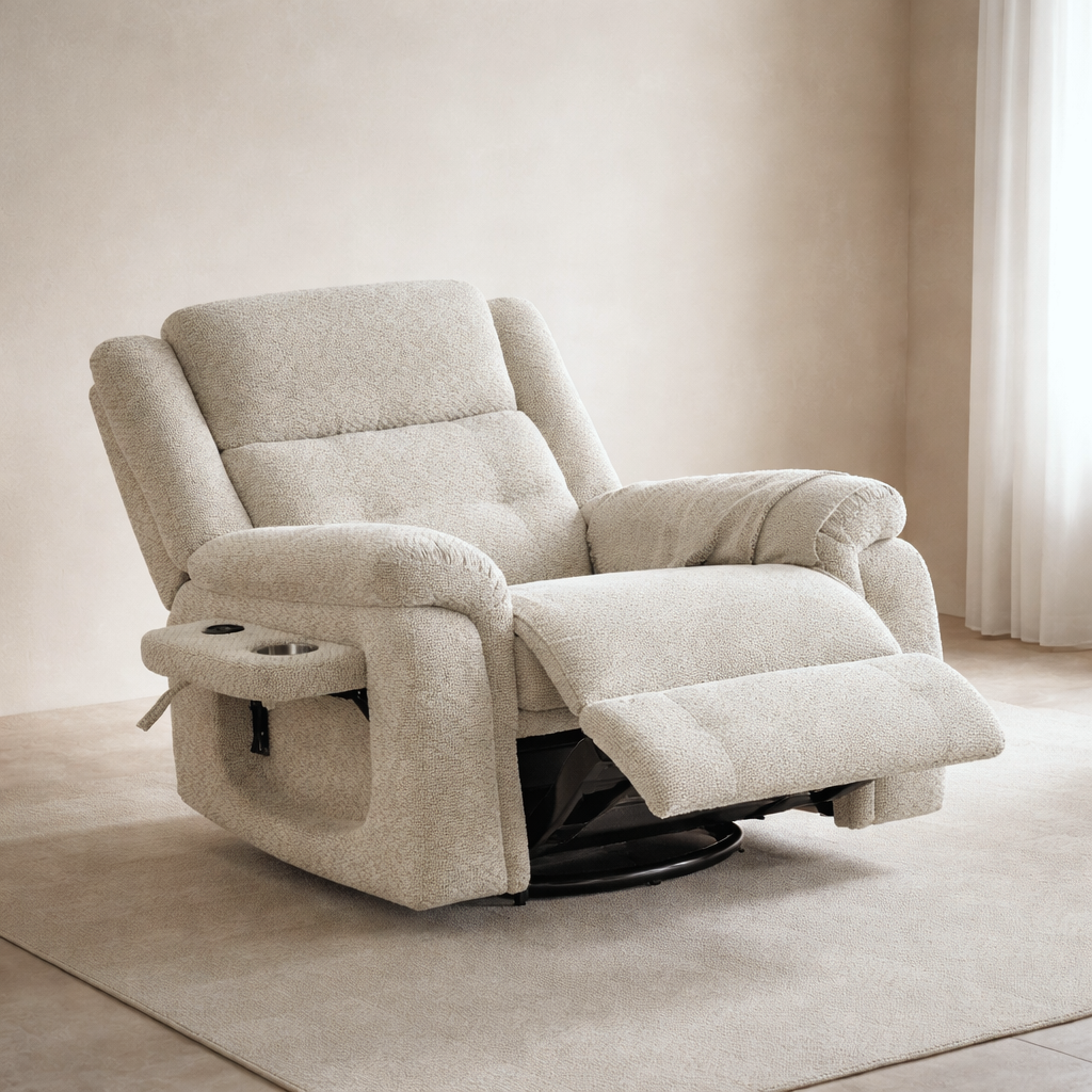 | مميزات المنتج | تدليك اهتزازي بـ8 نقاط يمنح استرخاءً متكاملاً حشوة إسفنجية عالية الكثافة مع نوابض داخلية لراحة ودعم يدومان. آلية استرخاء يدوية بتصميم عملي مع خاصية الدوران والتأرجح طاولة جانبية أنيقة مزوّدة بحامل أكواب وشاحن لاسلكي. |