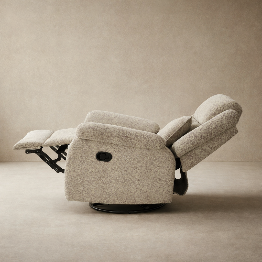 كرسي استرخاء يدوي مع خاصية الدوران والحركة الانزلاقية، مصمم لتوفير أقصى درجات الراحة والاسترخاء أثناء الجلوس.لماذا لوكسي؟ لأنه يجمع بين الفخامة والراحة والمتانة في قطعة واحدة، ويحوّل غرفة نومك إلى مساحة أنيقة ومريحة. لا تتردد واطلبه الآن من متجر بيتونيا!