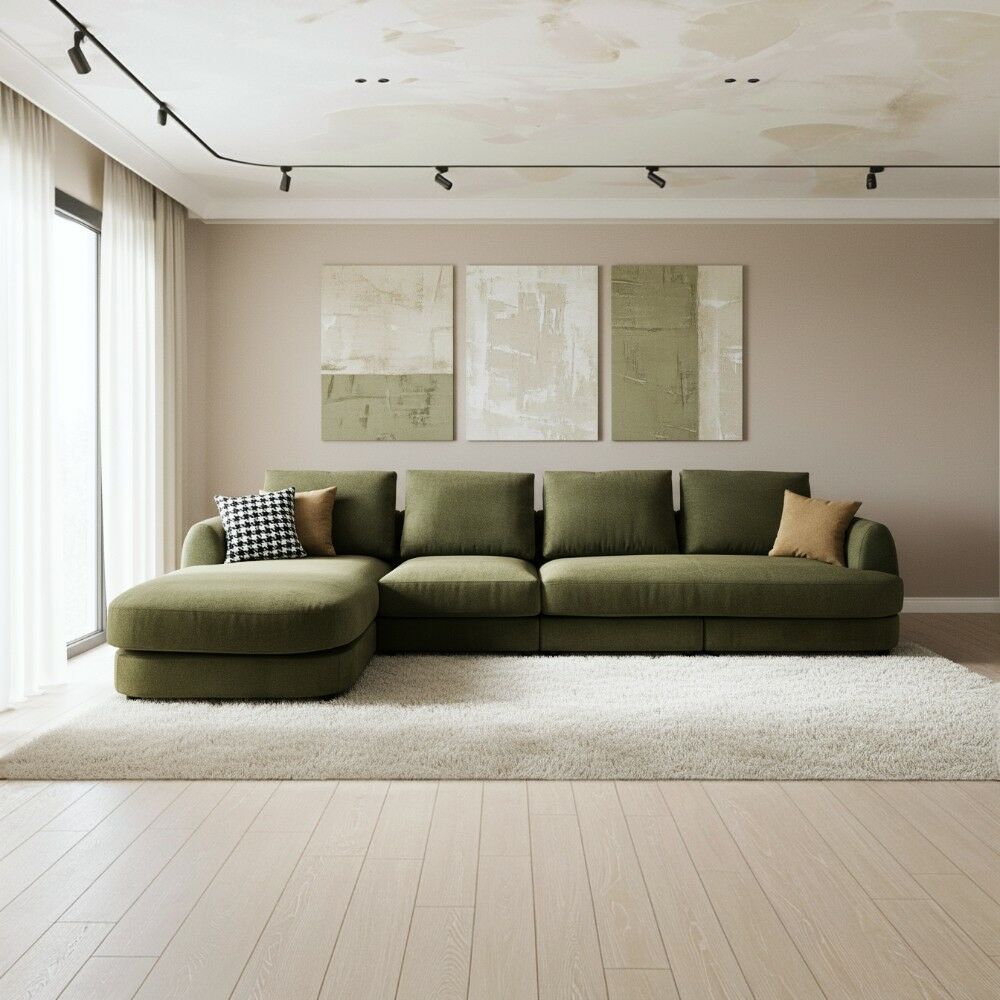 أخضر أنيق وهادئ، سهل التنسيق مع الألوان المحايدة والخشبية، ويضفي إحساسًا بالانتعاش والحيوية على غرفة المعيشة.التصميم: