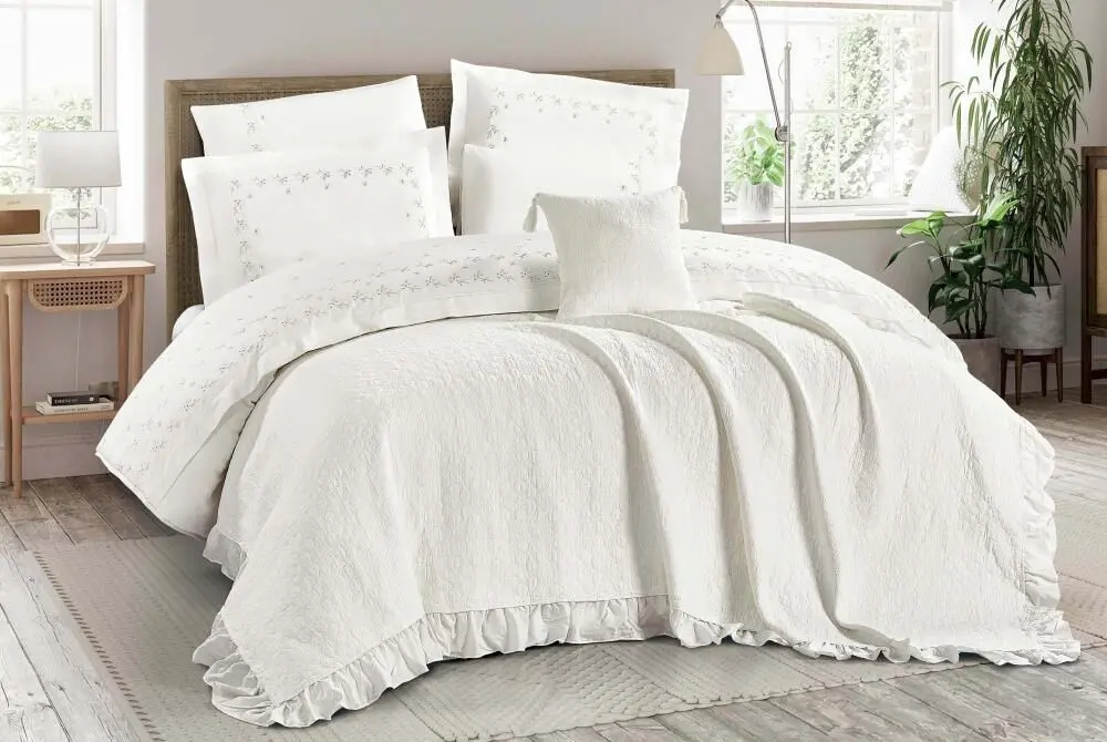 قياس اللحاف الطول 270 - العرض 250 سم قياس غطاء السرير الطول 260 - العرض 240 سم قياس الشرشف المطاط الطول 200 - العرض 200 + 40 سم قياس غطاء وسادة بحواف الطول 75 - العرض 50 + 5 سم قياس غطاء وسادة الطول 75 - العرض 50 سم قياس الخدادية الطول 45 - العرض 45 سم |