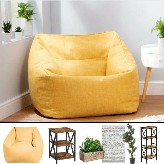 يتضمن الطقم 1كرسي بين باج , 1ستاند رفوف( 4 أدوار ), 1طاولة جانبية( 3 رفوف) , 1 سجادة جومانا ذات وجهين , 1نبات صناعي ,1 مركن مع نبات صناعي