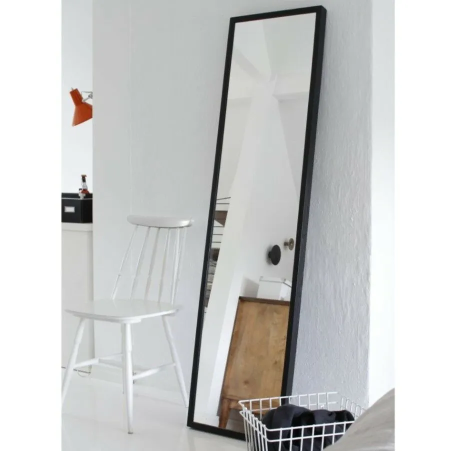 مرأة ارضية مميزة باطار اسود مصنوعة من الزجاج والخشب مع تفاصيل مميزة تجمع بين التصميم العصري والجودة العالية لإضفاء لمسة أنيقة على المساحة المعيشية في منزلك