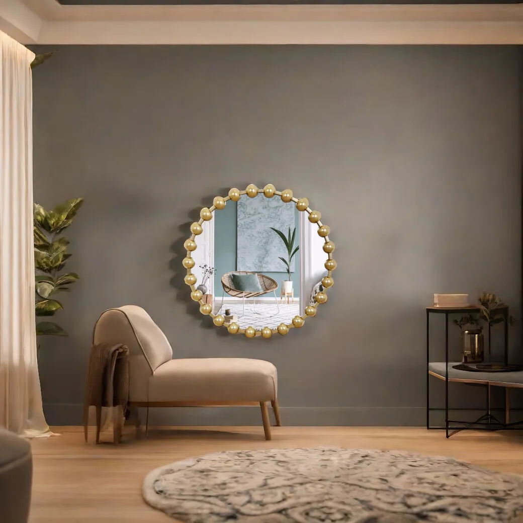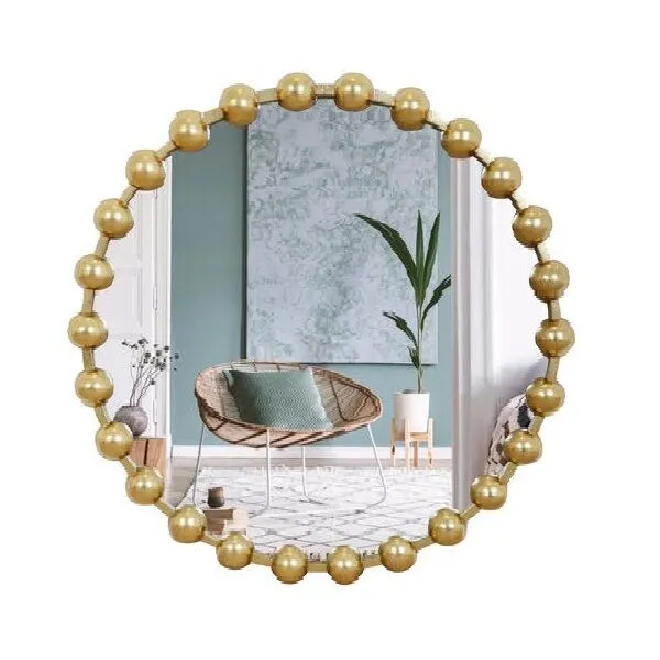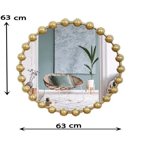 • مرآة حائط دائرية ديكور جانبي بإطار حديد لون ذهبي مع تفاصيل مميزة تجمع بين التصميم العصري والجودة العالية لإضفاء لمسة أنيقة على المساحة المعيشية في منزلك.