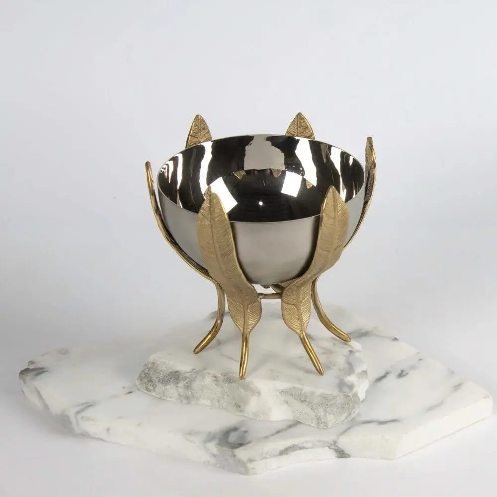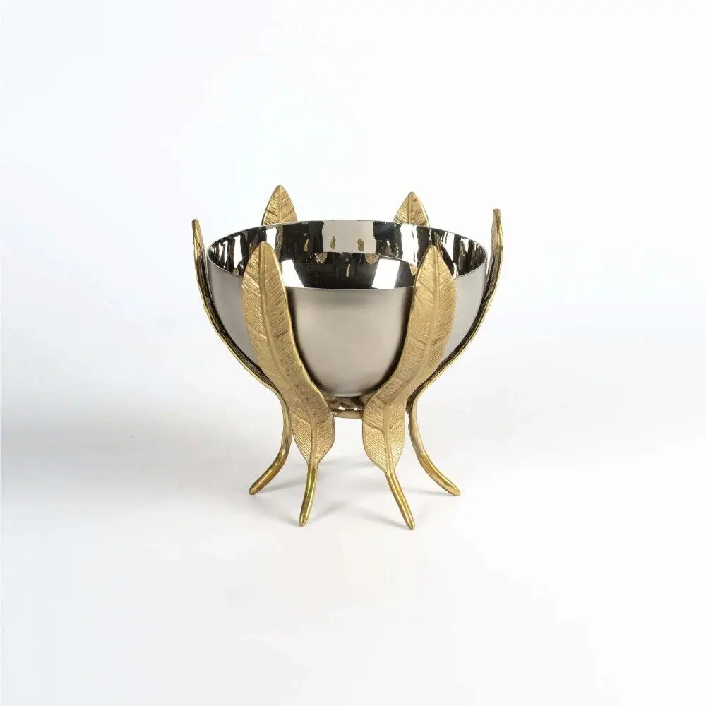 ريش ذهبي يرفع وعاءً بيضاوياً فضياً لامعاً على قاعدة ليشكّل قطعة مركزية فاخرة وملفتة. يمكن ملؤه بالأطعمة الساخنة أو الباردة، أو الحلوى والمكسرات، أو حتى وضع التفاح الأخضر أو البرتقال فيه لعرض أنيق على طاولة الطعام.