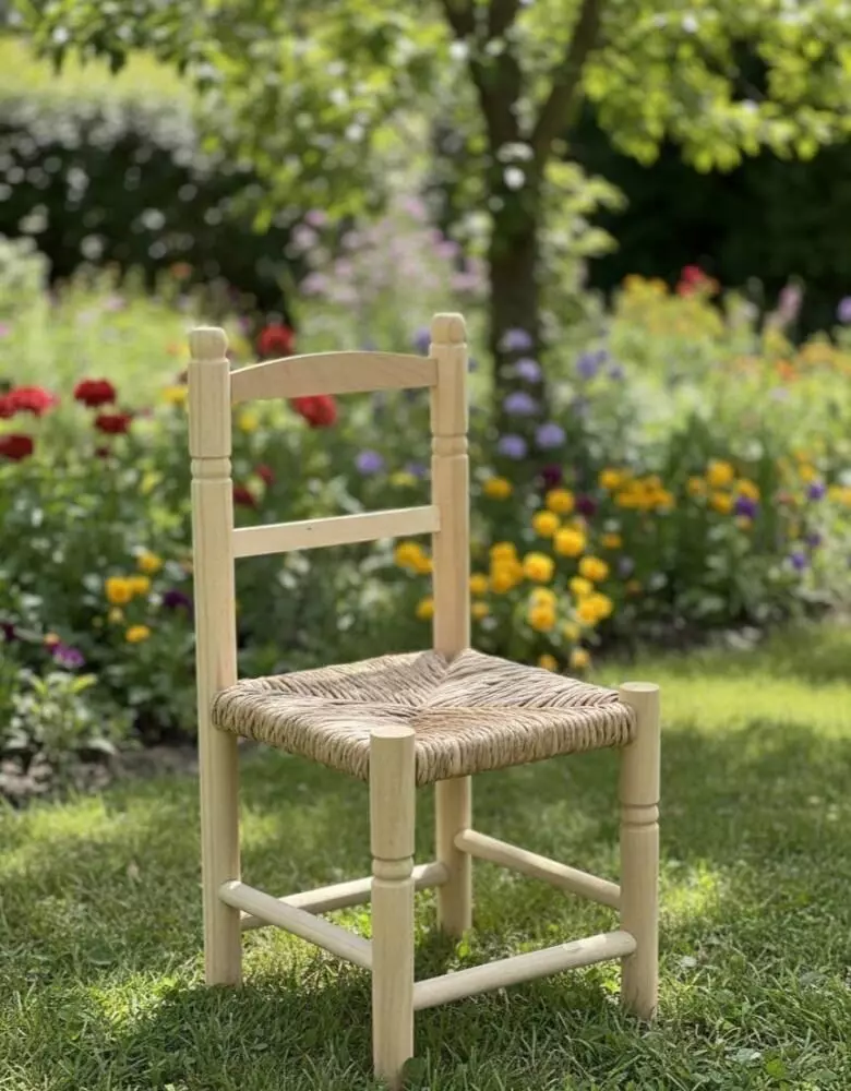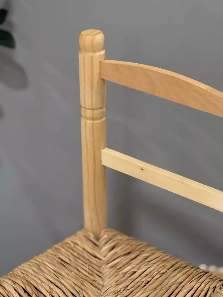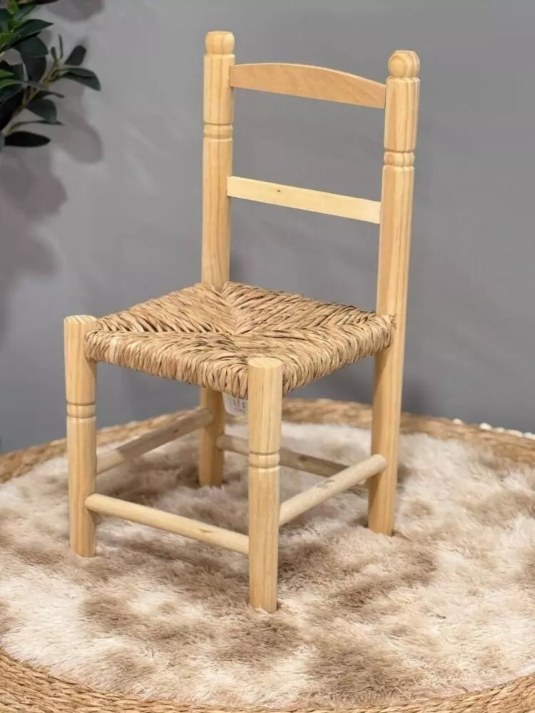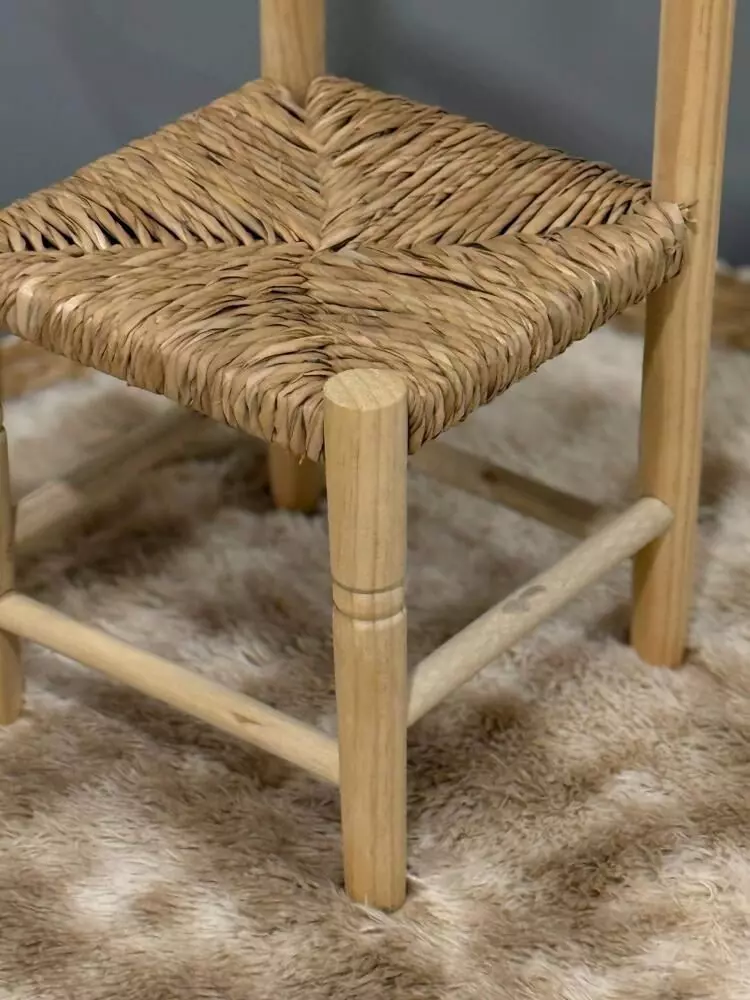 كرسي أطفال أنيق يعكس روح البساطة الريفية الأصيلة، مصنوع يدويًا من الخشب الطبيعي مع مقعد من حبال الخوص المنسوجة بدقة عالية. تصميم عملي وخفيف، يضفي لمسة دافئة على غرف الأطفال والمساحات المنزلية، مع أجواء تراثية تزيد من جمال المكان.